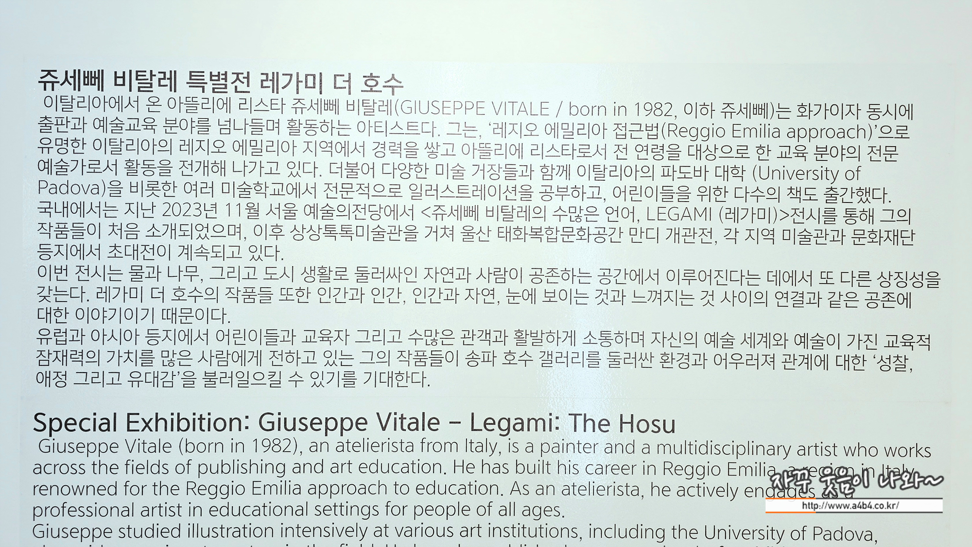 잠실 석촌호수 동호 더 갤러리 호수에서 열리고 있는 '주세뻬 비탈레 특별전 레가미 더 호수' 전시회는 이번달 말인 6월 25일 수요일까지 열릴예정입니다. 특히 아이와 함께 야외 나들이 계획이 있다면 추천하는 전시회입니다.