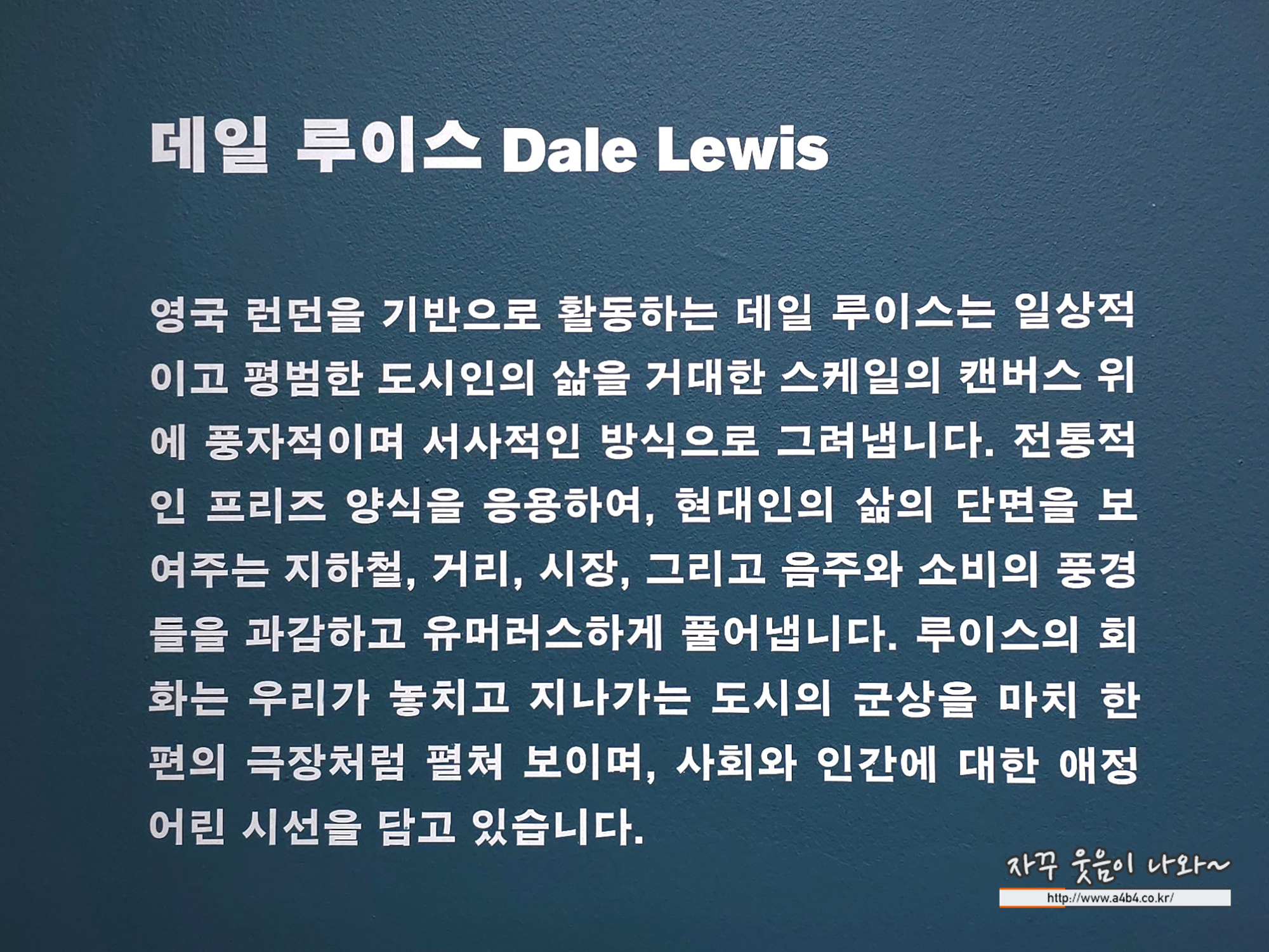 영국 런던을 기반으로 활동하는 데일 루이스는 일상적이고 평범한 도시인의 삶을 거대한 스케일의 캔버스 위에 풍자적이며 서사적인 방식으로 그려냅니다. 전통적인 프리즈 양식을 응용하여, 현대인의 삶의 단면을 보여주는 지하철, 거리, 시장, 그리고 음주와 소비의 풍경들을 과감하고 유머러스하게 풀어냅니다. 루이스의 회화는 우리가 놓치고 지나가는 도시의 군상을 마치 한 편의 극장처럼 펼쳐 보이며, 사회와 인간에 대한 애정 어린 시선을 담고 있습니다.