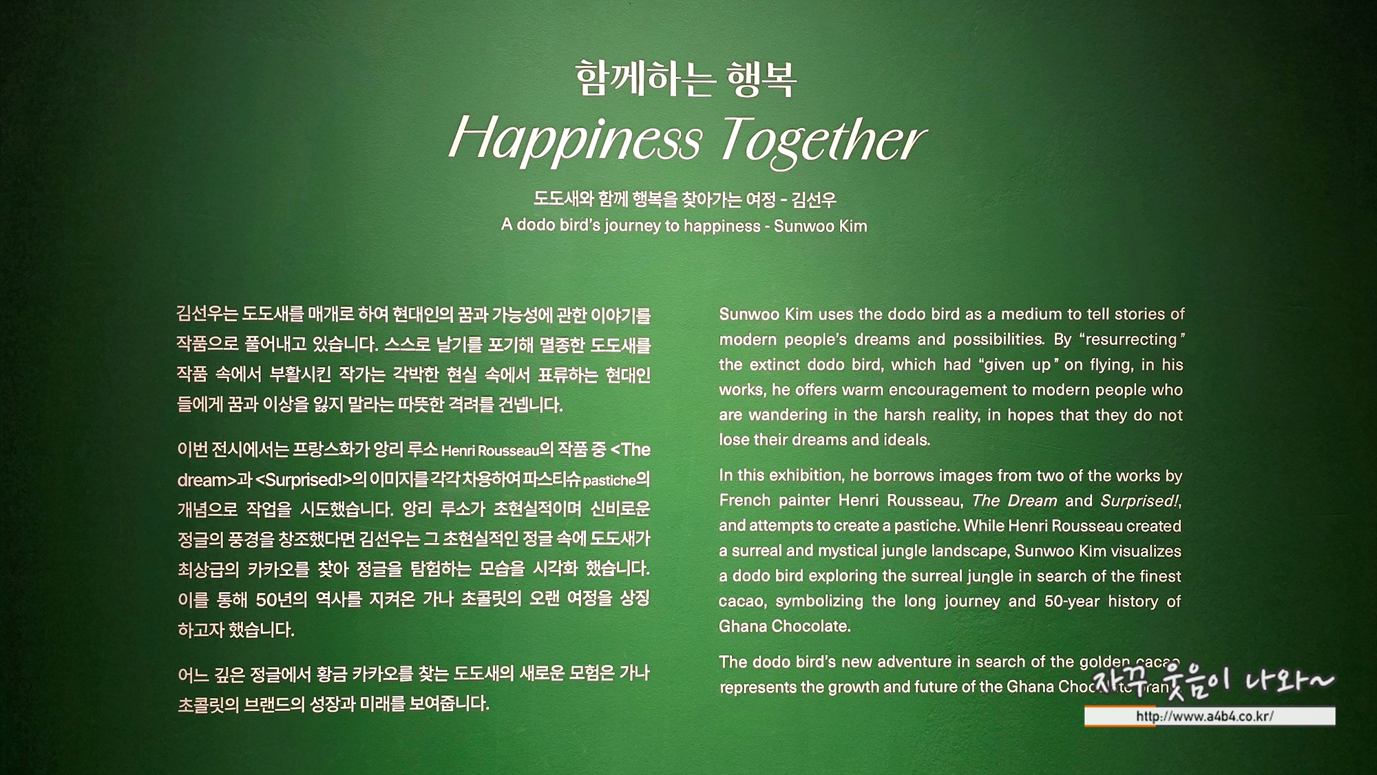 이번 전시회는 총 10개의 섹션으로 구성되어 있으며 가나 초콜릿의 역사와 함께 최근 핫 한 대한민국 작가 5인의 초콜릿을 모티프로 한 여러 작품을 만나볼 수 있습니다. 관람시간은 대략 한 시간, 최대 90분이면 충분해 보입니다.
