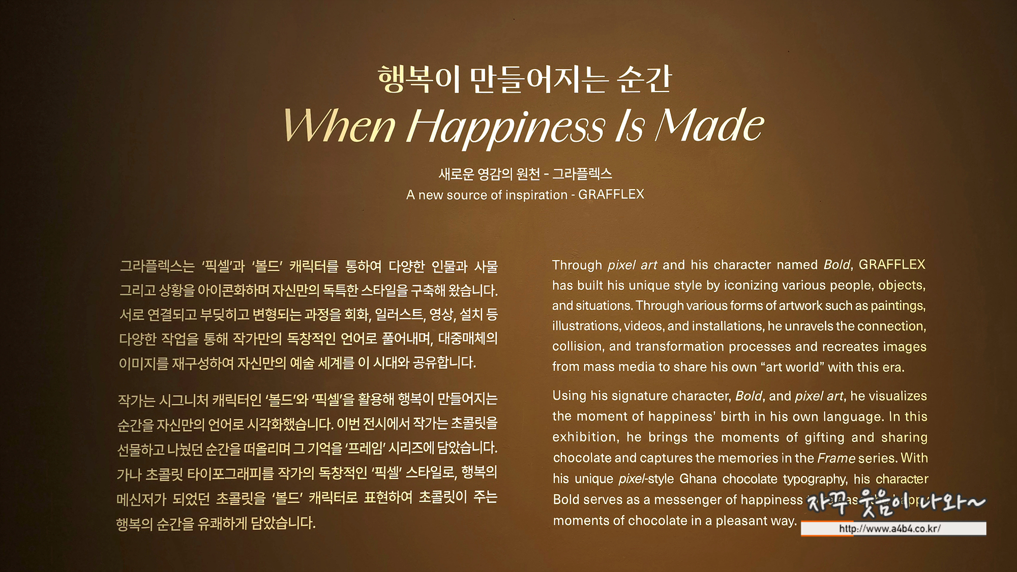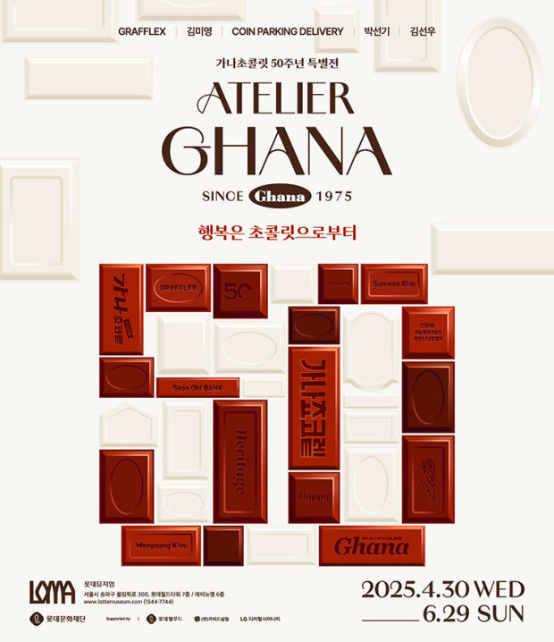 각기 다른 조형 언어로 시각적 상상력을 불어넣는 국내외 현대미술 작가 5인(GRAFFLEX, 김미영, COIN PARKING DELIVERY, 박선기, 김선우)을 통해 가나 초콜릿이 가져다주는 감각적 경험을 예술적 상징으로 풀어냈습니다. GRAFFLEX는 초콜릿이 탄생하는 순간을 자신만의 언어로 시각화한 공간으로 구현하였고, 김미영은 초콜릿의 부드러운 물성과 작가 고유의 작업 방식을 매칭시켜 하나의 거대한 영상 작업으로 펼쳐냅니다.