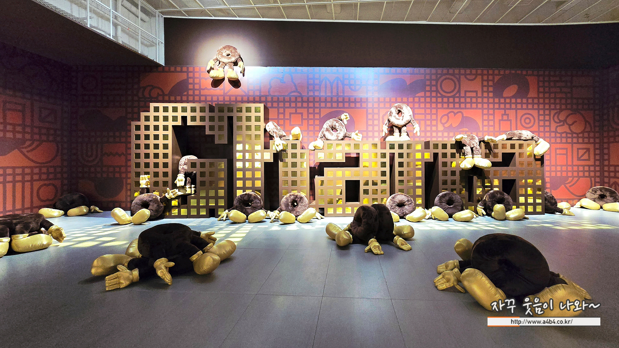 이 작품 속 카카오 인형들은 관람객이 인형에 앉아 쉬거나 인형과 함께 사진 찍기도 하는데요. 아이들이 너무 거칠게 다루네요.