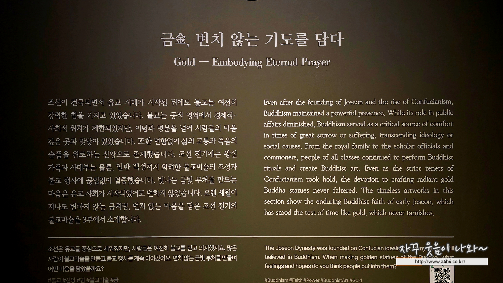 이번 전시회는 총 3개 섹션으로 구성되어 있는데, 마지막 섹션인 조선 전기 불교미술을 다룬 '금金, 변치 않는 기도를 담다' 소개입니다. 이번 전시회에서 가장 화려하고 아름다운 섹션 + 마지막 특별섹션인 훈민정음 소개입니다.