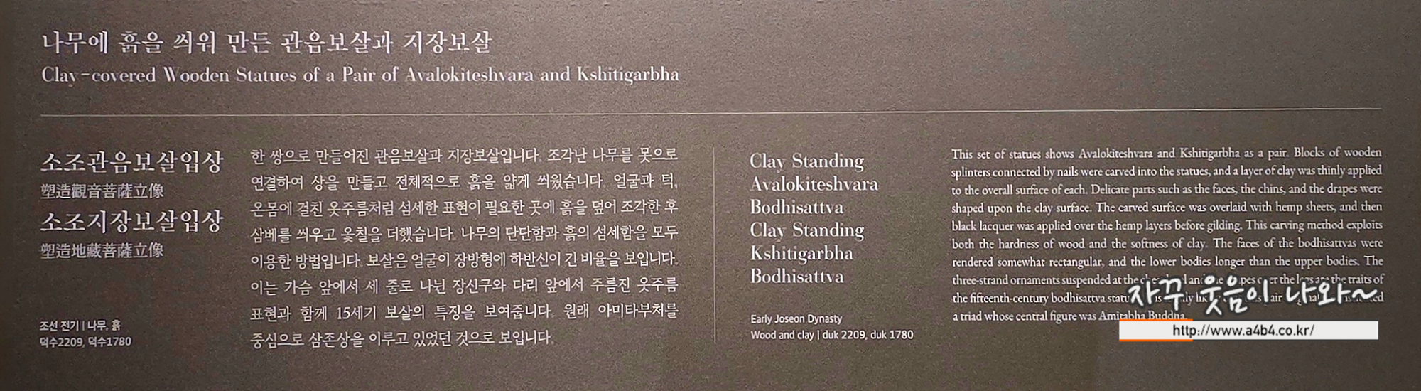 한 쌍으로 만들어진 관음보살과 지장보살입니다. 조각난 나무를 못으로 연결하여 상을 만들고 전체적으로 흙을 얇게 씌웠습니다. 얼굴과 턱, 온몸에 걸친 옷주름처럼 섬세한 표현이 필요한 곳에 흙을 덮어 조각한 후 삼베를 씌우고 옻칠을 더했습니다. 나무의 단단함과 흙의 섬세함을 모두 이용한 방법입니다. 보살은 얼굴이 장방형에 하반신이 긴 비율을 보입니다. 이는 가슴 앞에서 세 줄로 나뉜 장신구와 다리 앞에서 주름진 옷주름 표현과 함께 15세기 보살의 특징을 보여줍니다. 원래 아미타부처를 중심으로 삼존상을 이루고 있었던 것으로 보입니다.