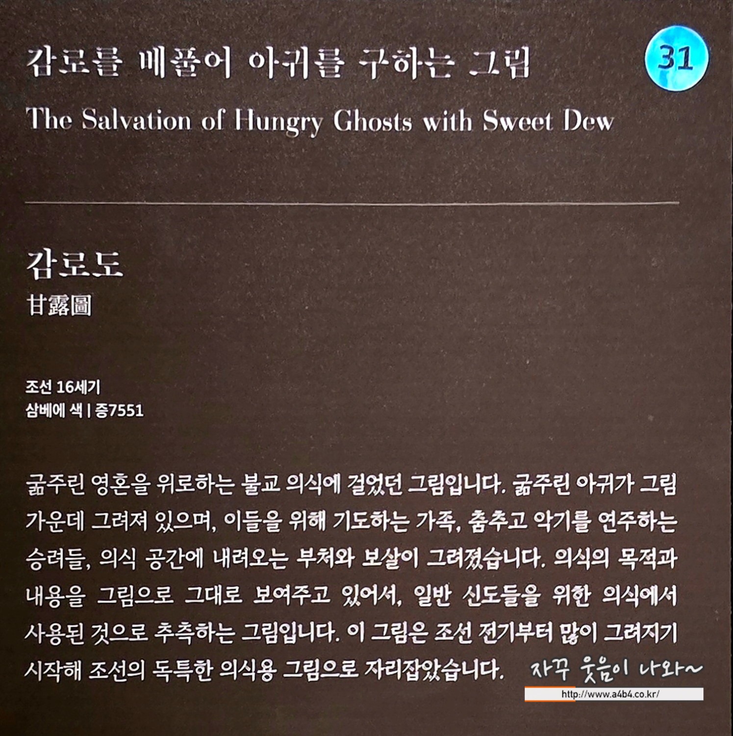 굶주린 영혼을 먹이고 위로하는 불교 의식에 걸었던 그림입니다. 굶주린 아귀가 그림 가운데 그려져 있으며, 이들을 위해 기도하는 가족, 춤추고 악기를 연주하는 승려들, 의식 공간에 내려오는 부처와 보살이 그려졌습니다. 의식의 목적과 절차, 내용을 그림으로 그대로 보여주고 있어서, 일반 신도들을 위한 의식에서 사용된 것으로 추측하는 그림입니다. 이 그림은 조선 전기부터 많이 그려지기 시작해 조선의 독특한 의식용 그림으로 자리잡았습니다.