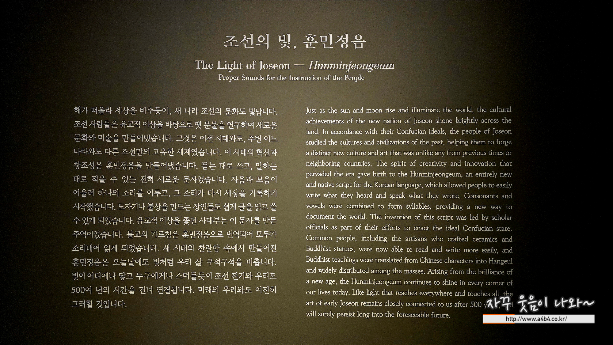 도자기나 불상을 만드는 장인들도 쉽게 글을 읽고 쓸 수 있게 되었습니다. 유교적 이상을 좇던 사대부는 한편으로 이 문자를 만드는 주역이었습니다. 불교의 가르침은 훈민정음으로 번역되어 모두가 소리내어 읽게 되었습니다. 새 시대의 찬란함 속에서 만들어진 훈민정음은 오늘날에도 빛처럼 우리 삶 구석구석을 비춥니다. 빛이 어디에나 닿고, 누구에게나 스며드는 것처럼, 조선 전기와 우리도 500여 년의 시간을 건너 연결됩니다. 앞으로의 우리와도 여전히 그러할 것입니다.