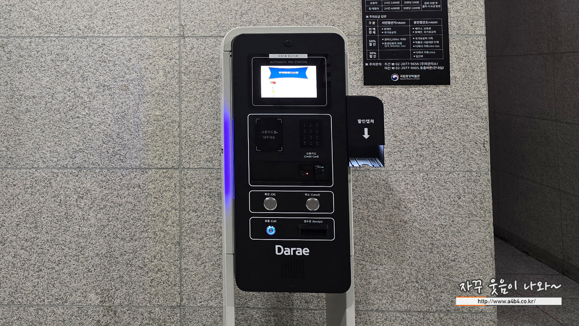 장애인 또는 국가유공자는 주차요금 무료, 경차나 친환경차 방문자는 국립중앙박물관 주차요금 할인 50% 됩니다. 정산은 지하주차장 무인 정산기에서 가능한데요. 이제는 대부분의 공공기관 주차정산기에서 친환경차 전산연동이 완료된 것 같습니다.