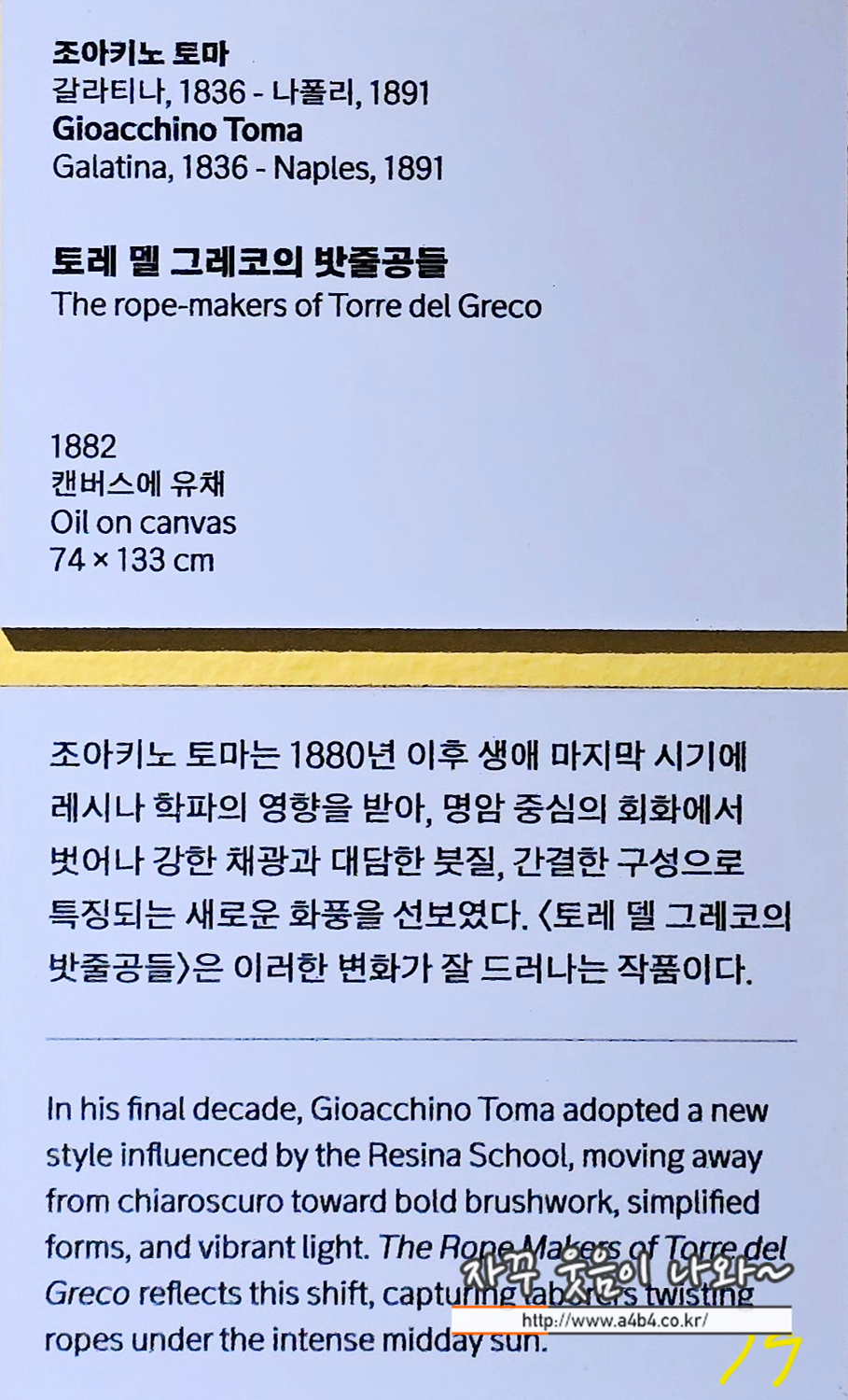 특히 이탈리아 국립 카포디몬테 미술관 19세기 컬렉션에 전시된 작품들과 작가들은 저에게는 상당히 낮설고 검색에도 잘 나오지 않는 작가들과 작품들이 많았는데요. 이번 도슨트를 통해 상당히 재미있고 흥미로운 이야기를 만나볼 수 있었습니다. 가능하시다면 시간내서 도슨트 꼭 참석하세요.