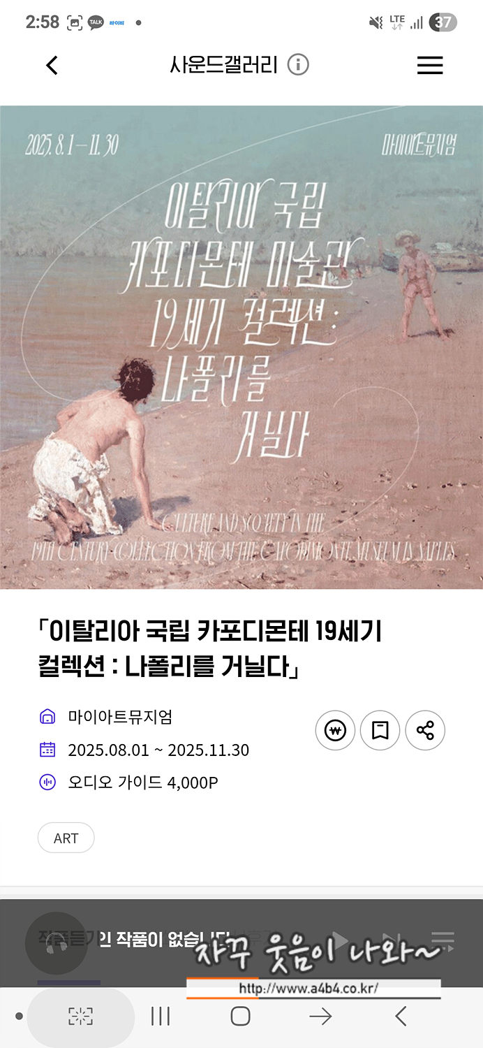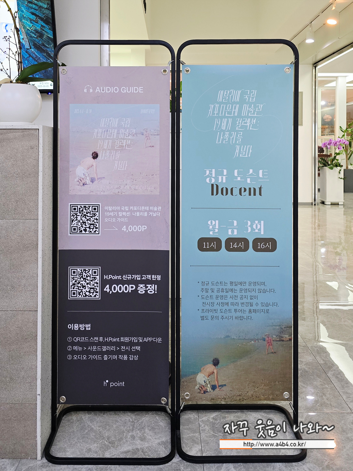 만약 도슨트 시간에 맞추기 어렵다면 이탈리아 국립 카포디몬테 미술관 컬렉션 오디오가이드가 H.Point 앱에서 제공됩니다. 다만 오디오가이드 이용요금은 4,000원 입니다. 이어폰 꼭 챙기시고요. 이제는 전시회 오디오 가이드는 서비스가 아닌 하나의 수익 사업으로 인식되고 있네요.