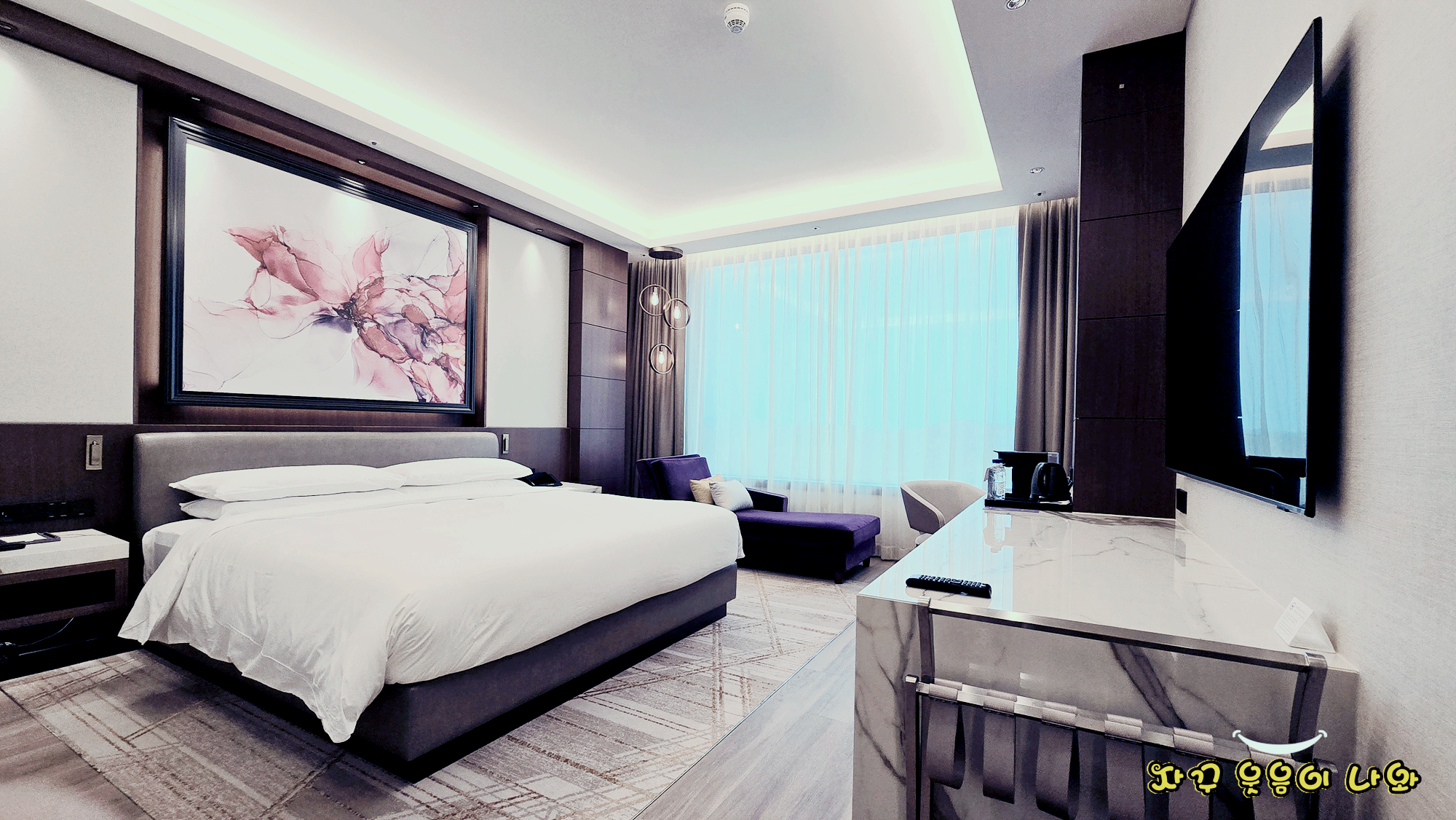 인스파이어 리조트 선타워 디럭스킹 룸입니다. 킹배드 한 개와 욕실, 쇼파로 구성되어 있습니다.