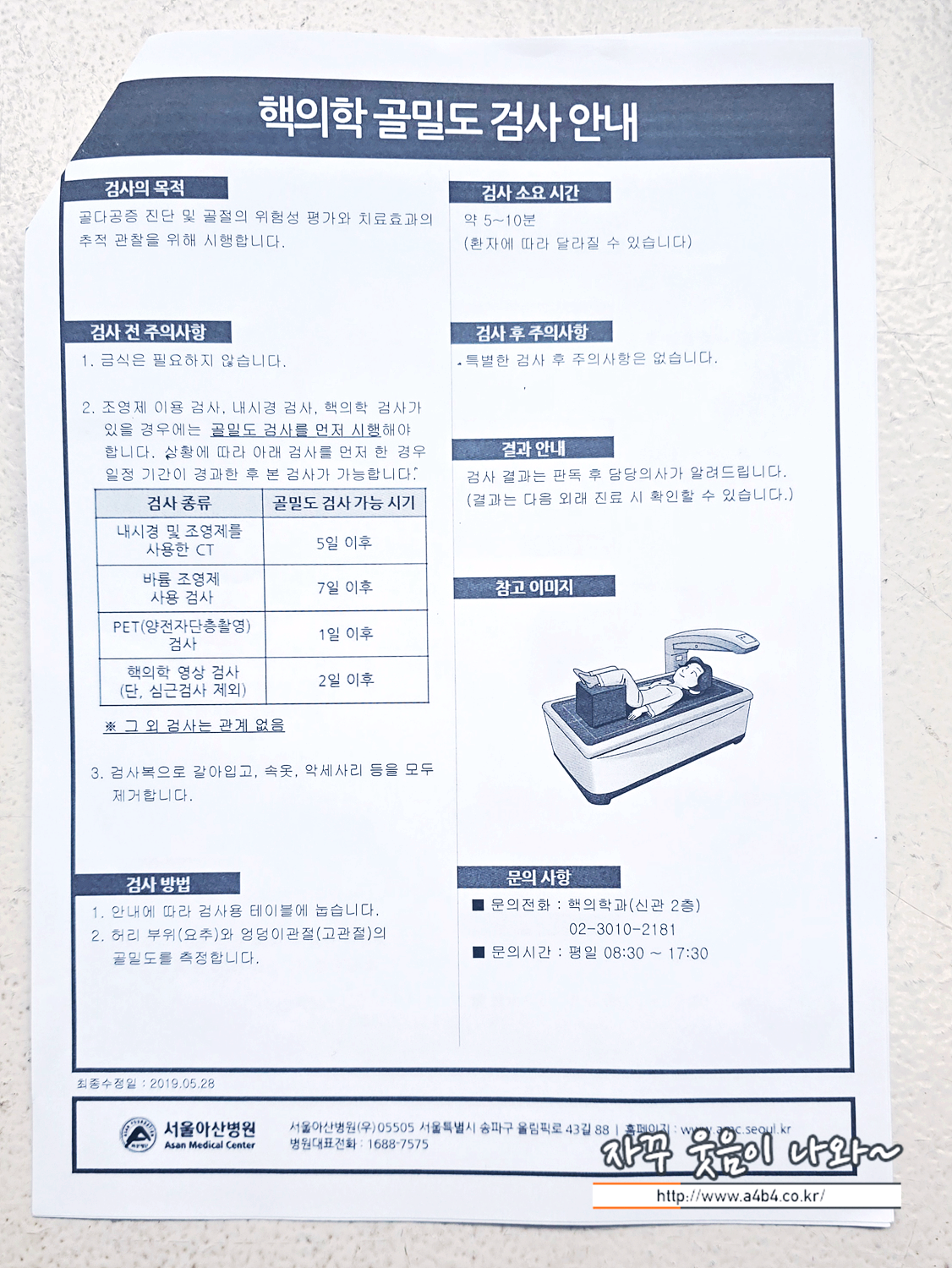 12월 두 번 서울아산병원 방문합니다. 한 번은 이중에너지 방사선 흡수계측법 골밀도 검사와