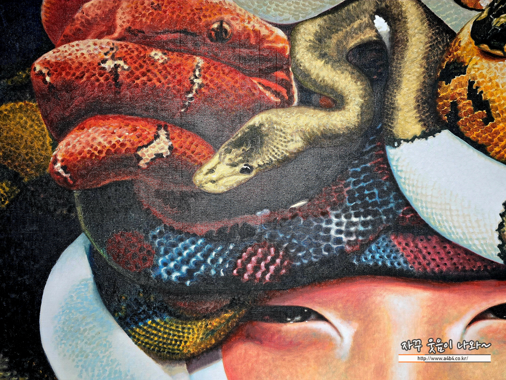 온갖 색의 비늘이 뒤엉켜, 얼굴을 신성한 가면처럼 두른다. 하얀 뱀의 미소와 붉은 입술이 생과 죽음의 경계에서 운명을 예언하듯 빛난다.
