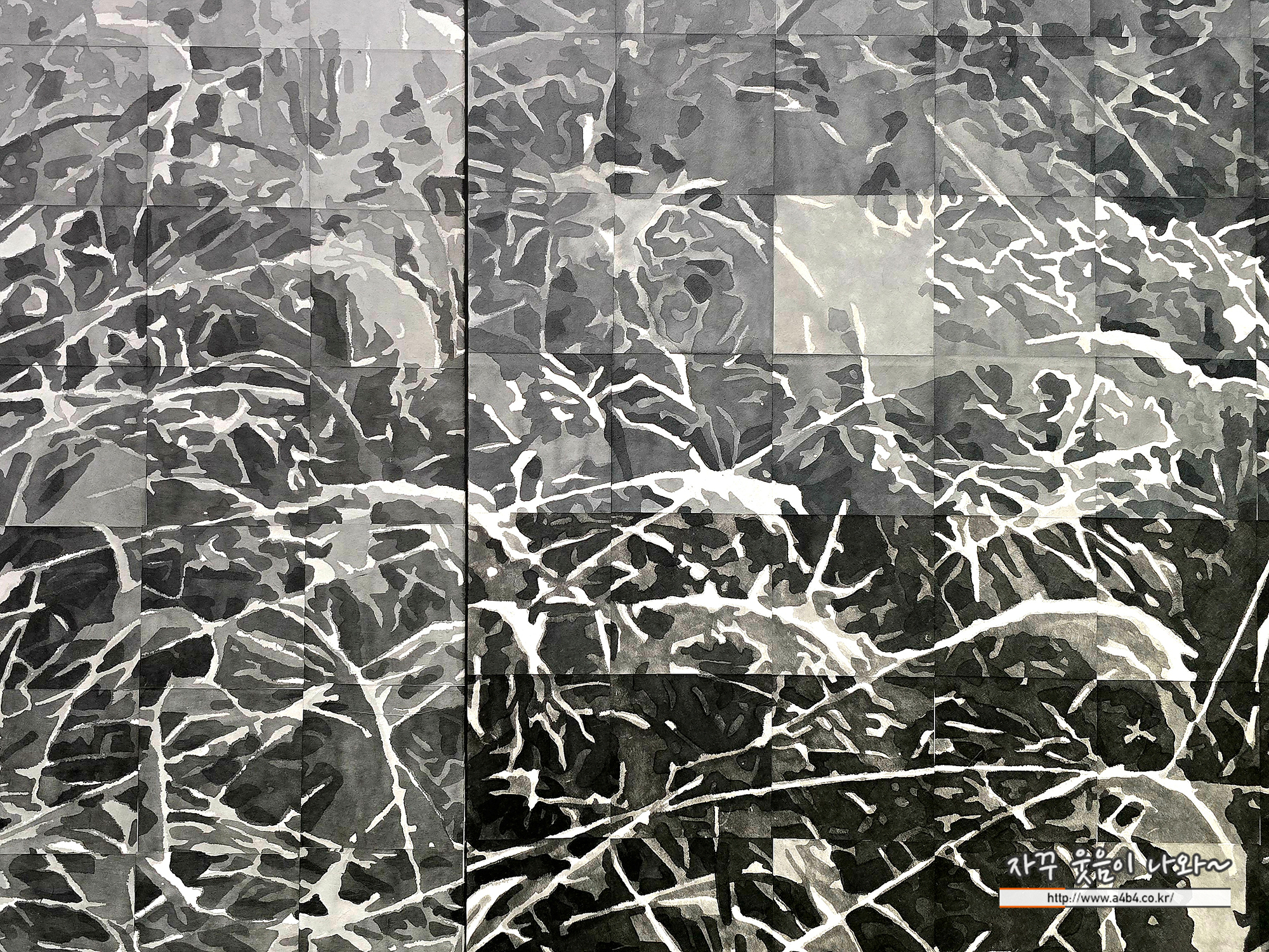 한 눈에 보기에 상하좌우의 구분이 어려울 정도로 화면이 균등하게 구성되어 있습니다. 작가는 원근법을 해체해 의도적으로 평면성을 추구하며 동등한 힘과 에너지, 밀도로 대상을 배치해 조화와 평등을 추구했습니다. 박지수 작가에게 자연은 인간이 지배하는 대상이 아닌 생성과 소멸의 과정을 반복하며 유기적으로 변화하는 존재이자 모든 것이 공존하는 상징적인 장소입니다.