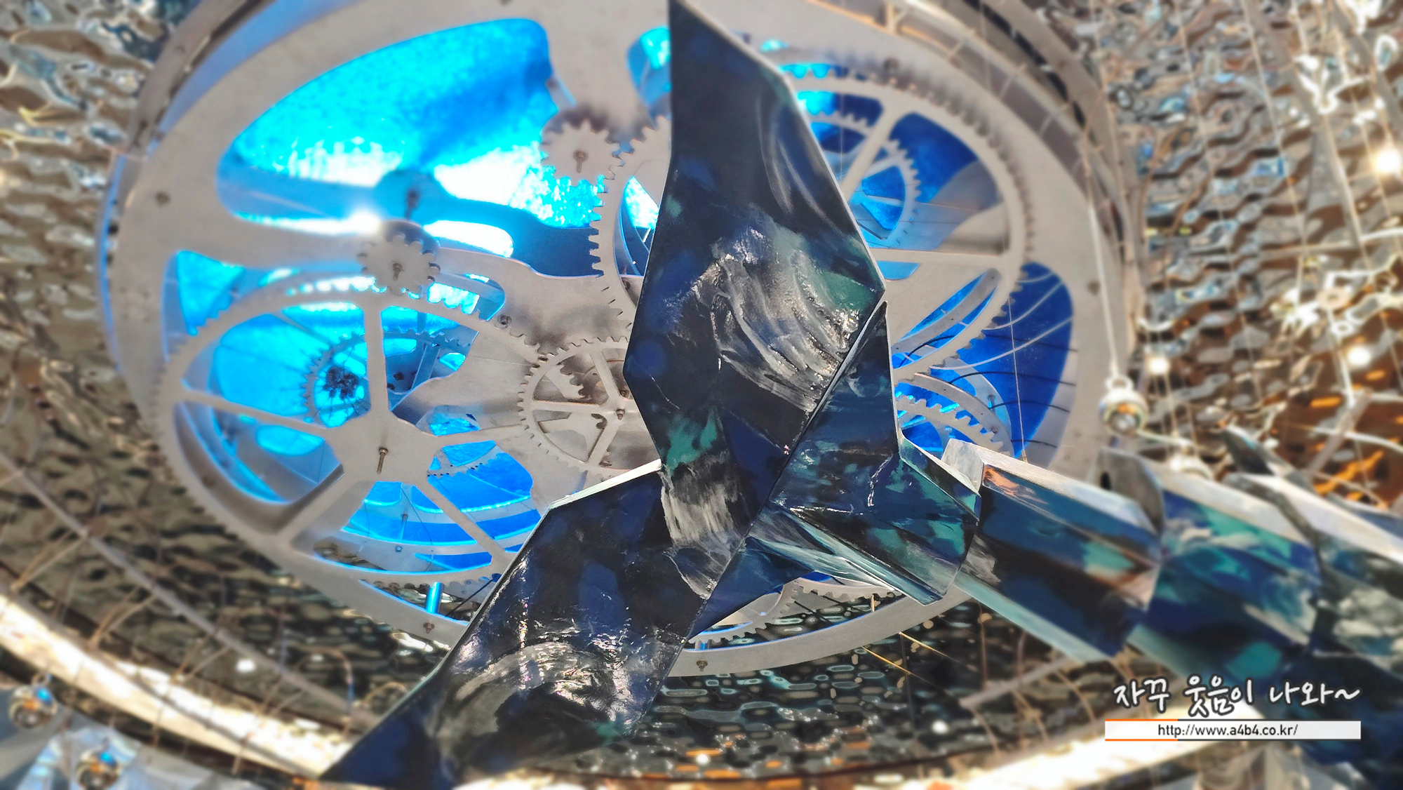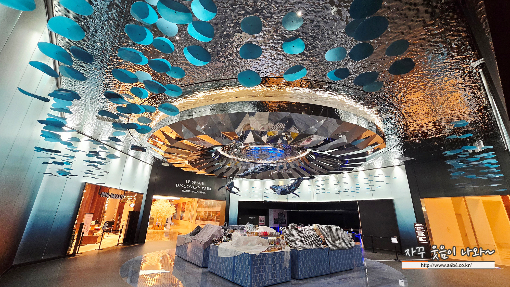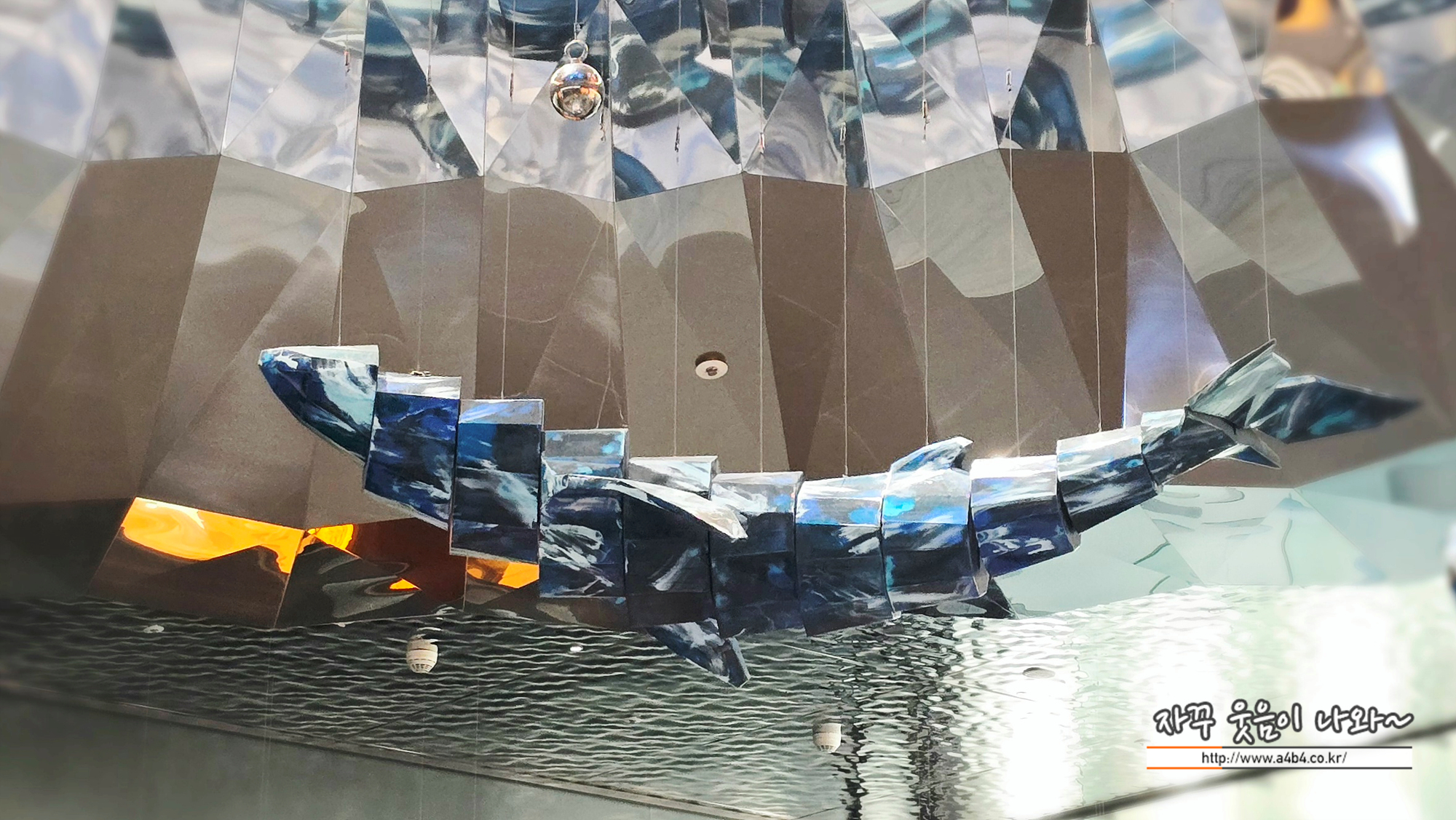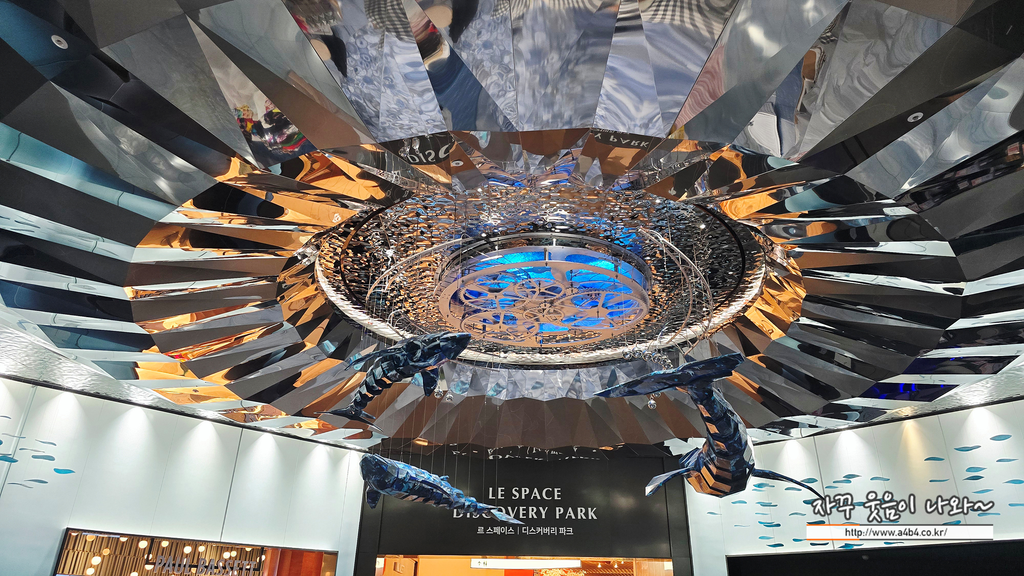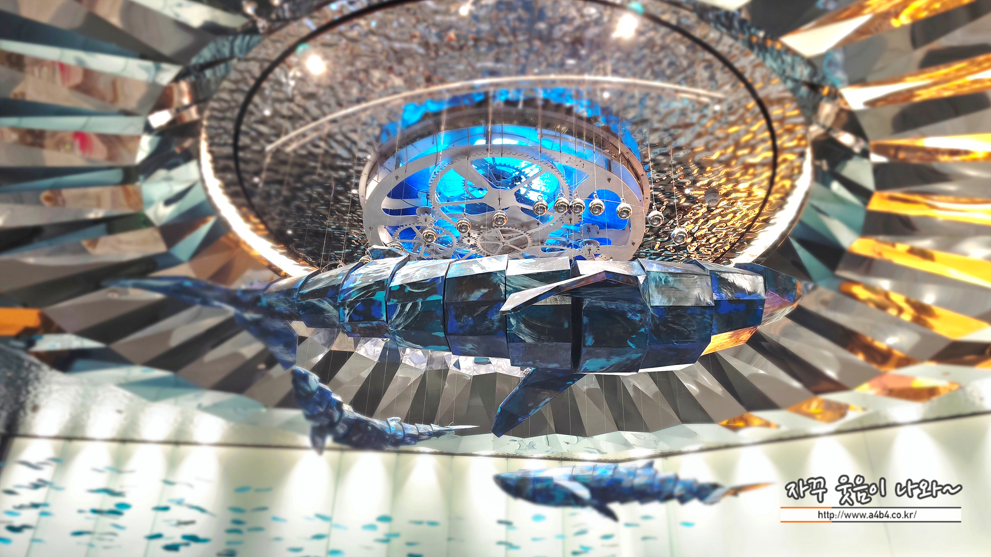 홀 상단에는 고래가 유영하고 다니는 볼거리와 상당히 매카닉한 조형물은 만나볼 수 있는데요.