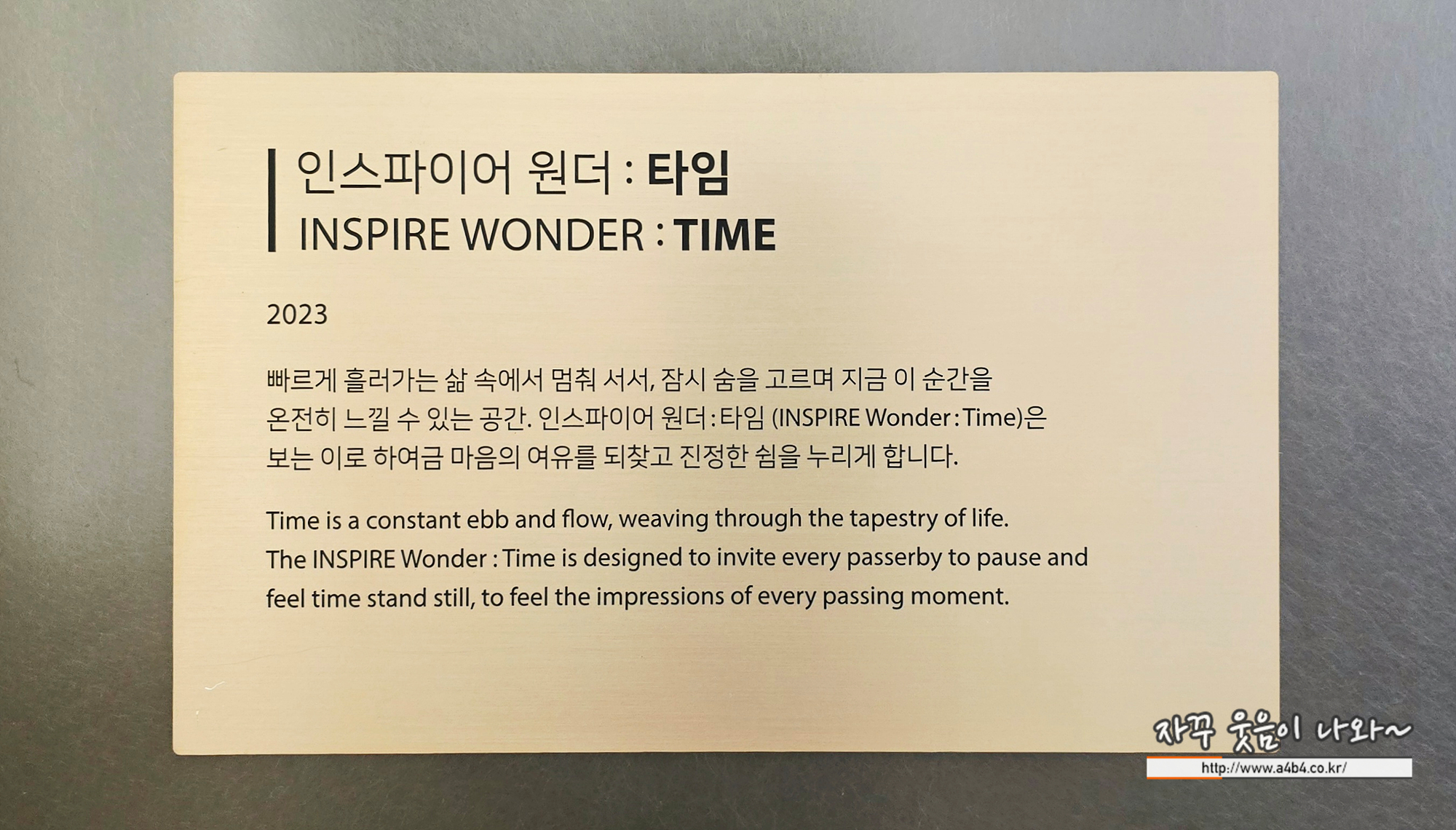 빠르게 흘러가는 삶 속에서 멈춰 서서, 잠시 숨을 고르며 지금 이 순간을 온전히 느낄 수 있는 공간. 인스파이어 원더 : 타임 (INSPIRE Wonder : Time)은 보는 이로 하여금 마음의 여유를 되찾고 진정한 쉼을 누리게 합니다.