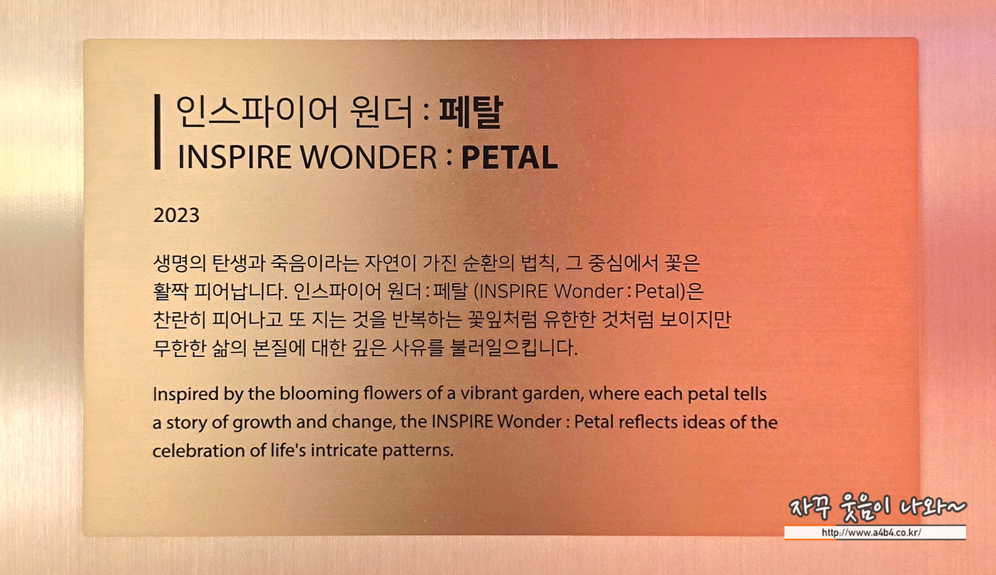 생명의 탄생과 죽음이라는 자연이 가진 순환의 법칙, 그 중심에서 꽃은 활짝 피어납니다. 인스파이어 원더 : 페탈 (INSPIRE Wonder : Petal)은 찬란히 피어나고 또 지는 것을 반복하는 꽃잎처럼 유한한 것처럼 보이지만 무한한 삶의 본질에 대한 깊은 사유를 불러일으킵니다.