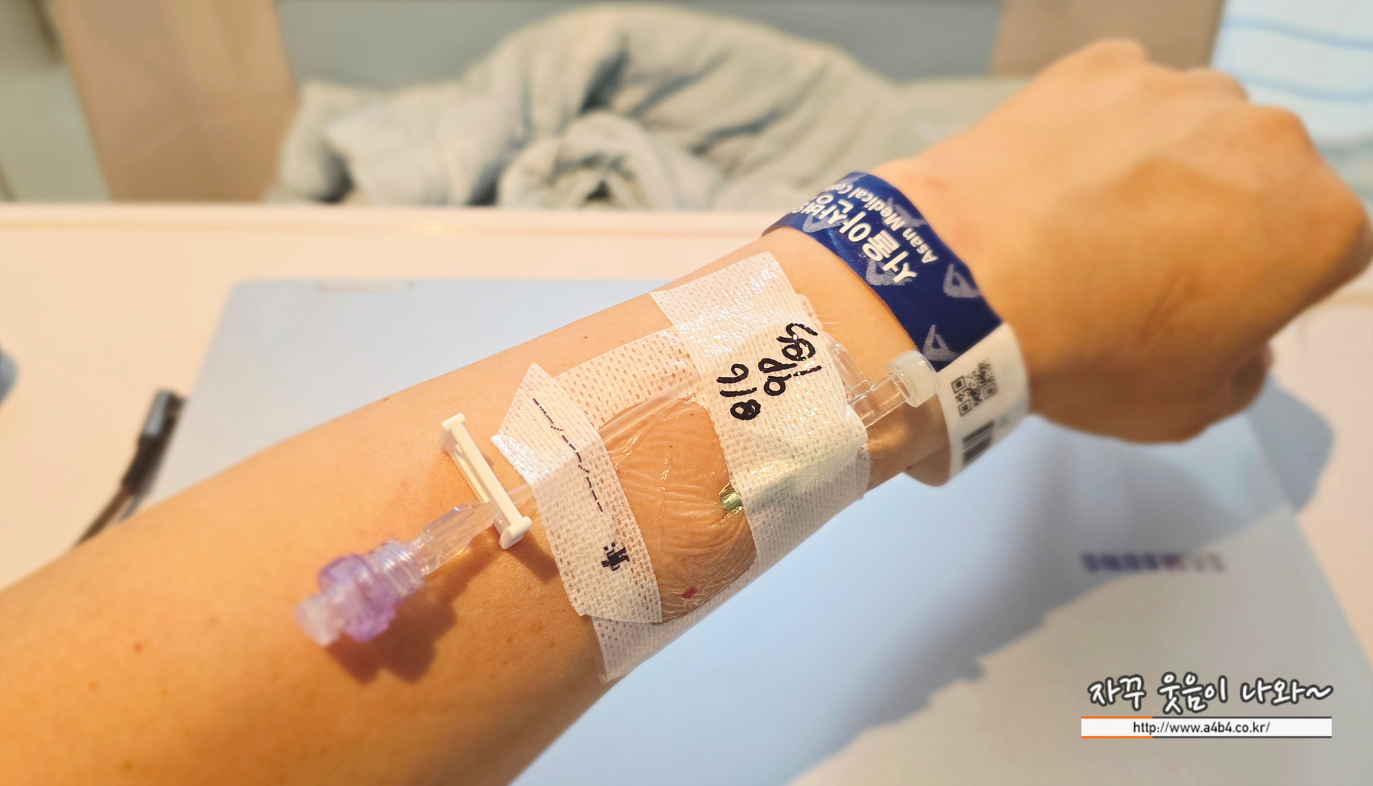 입원 후 샤워는 저녁식사 전까지 가능합니다. 저는 입원 저녁 잠자기 전에 샤워하고 자려고 했는데, 저녁에 팔에 이렇게 링거 관을 세팅해 주시네요. 낮에 땀 많이 흘렸는데, 샤워는 포기!