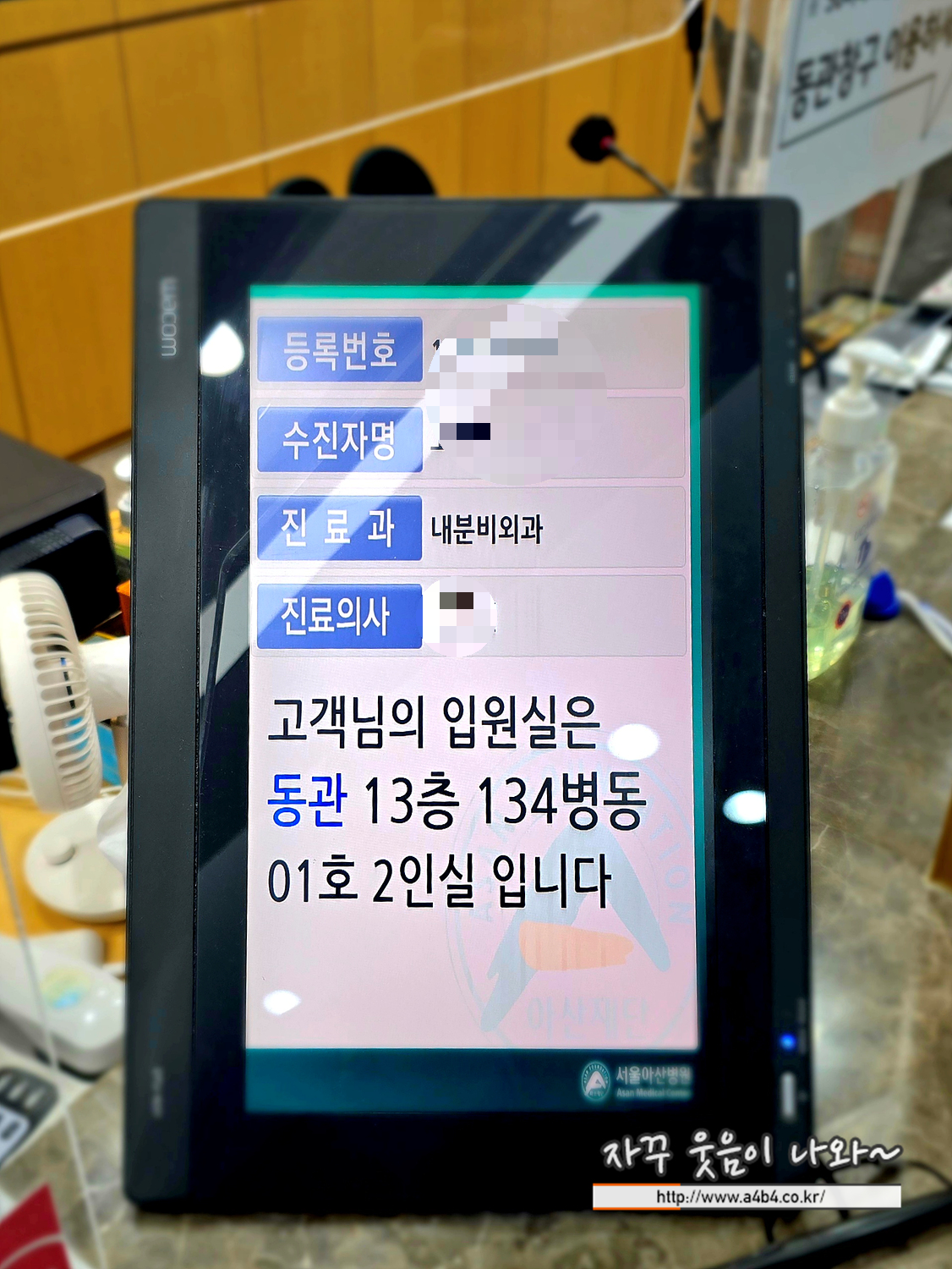 입원 수속하고 병실 배정받고, 안내문과 함께 입원할 아신병원 병실로 이동합니다.
