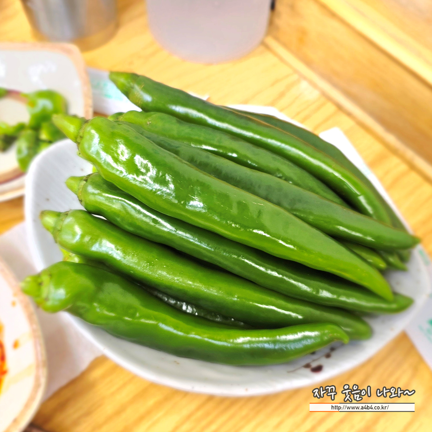 시원한 생수와 컵은 종이컵이 비치되어 있고요. 무엇보다도 테이블 위 수북한 고추가..