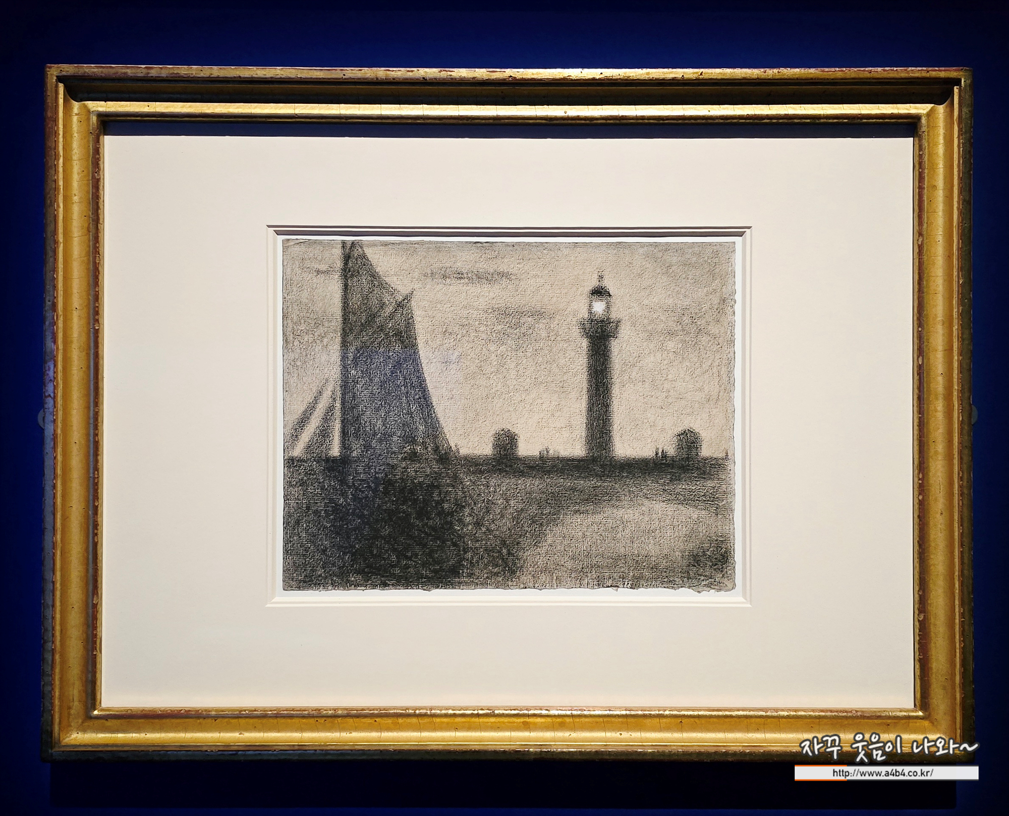 1886년 조르주 쇠라는 외젠 부댕 등 여러 화가가 활동하던 북부 노르망디의 항구 도시 옹플뢰르를 찾았다. 그는 이곳에서 많은 등대 그림을 남겼다. 이 작품에서는 해 질 무렵의 고요한 분위기 속, 방파제 등대 불빛을 따라 돛을 크게 부푼 낚싯배 한 척이 항구로 들어오고 있다. 쇠라는 선을 거의 쓰지 않고 콩테 크레용의 농담으로 형태를 표현했으며, 등대 불빛은 구아슈를 흰색으로 덧칠해 강조했다.