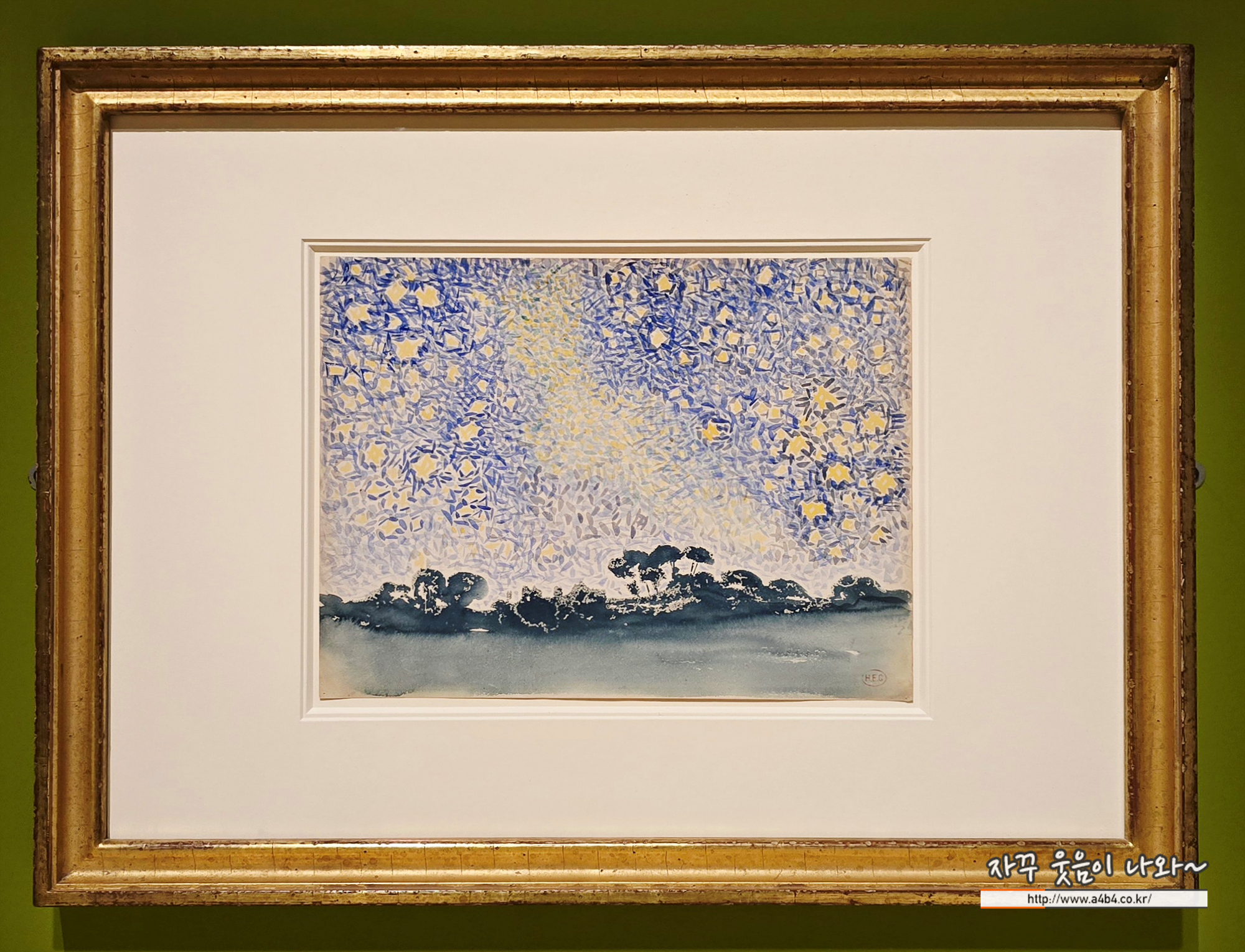 앙리 에드몽 크로스는 복잡한 준비와 시간이 필요한 유화보다, 화려한 색채를 빠르게 완성할 수 있는 수채화에 큰 매력을 느껴 꾸준히 작업했다. 이 작품에서 넓은 밤하늘은 반짝이는 노란 별빛으로 가득해 빈센트 반 고흐의 작품을 떠올리게 한다. 지평선 아래에는 청록색으로 길게 뻗은 땅과 먼 나무들의 윤곽이 아련하게 표현되어 있다.