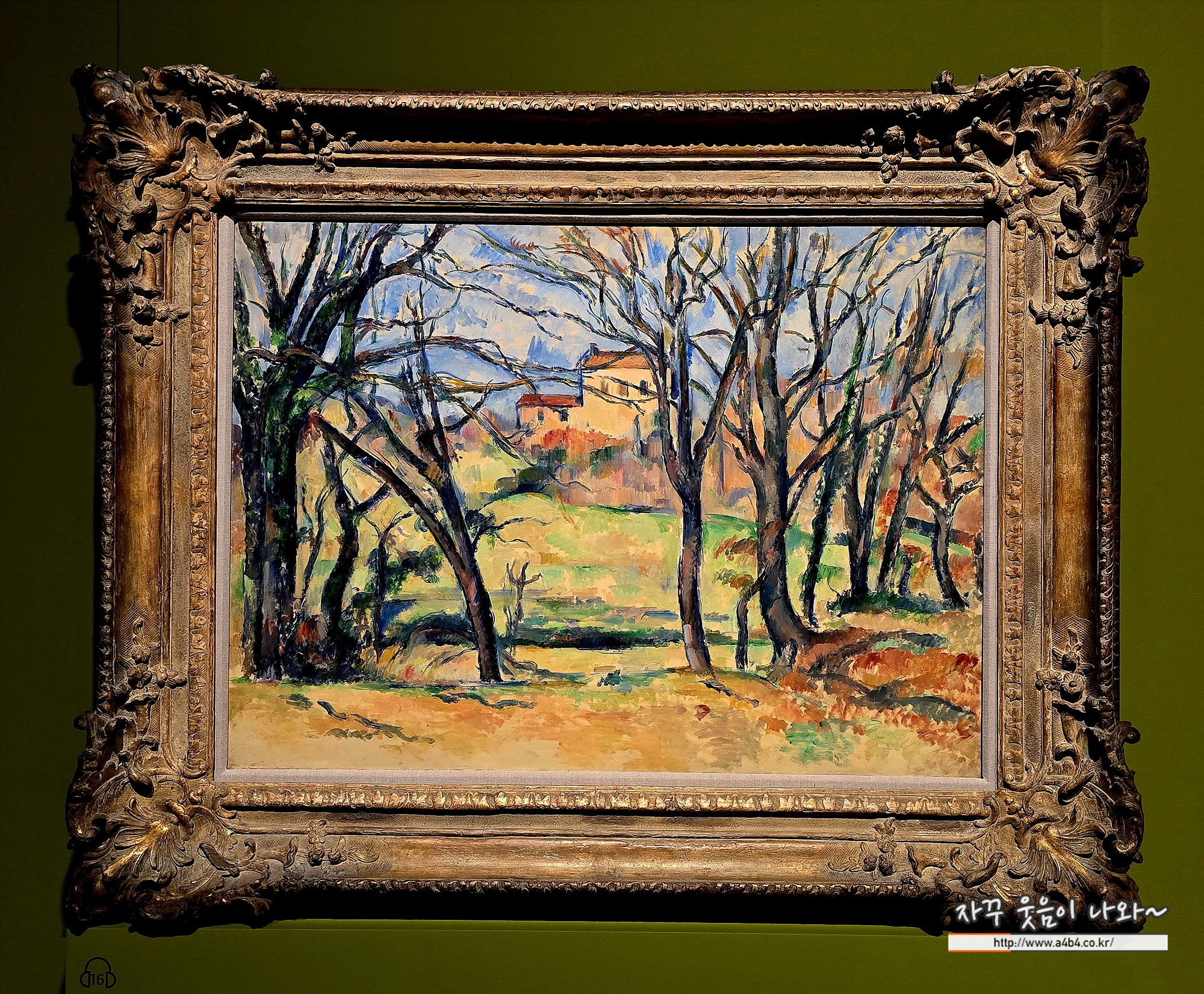 폴 세잔은 프랑스 남부 엑상프로방스 근교에서 가족과 살던 집 ‘자 드 부팡’의 풍경을 그렸다. 앞쪽에 늘어선 앙상한 나무들 사이로 바라본 장면을 독특한 구도로 구성했으며, 수직으로 솟은 나무줄기들을 언덕의 지평선과 나란히 배치해 화면이 격자무늬처럼 보이도록 했다. 또한 위쪽의 구불구불한 나뭇가지를 교차시켜 공간이 여러 겹으로 겹쳐 보이게 표현했다.