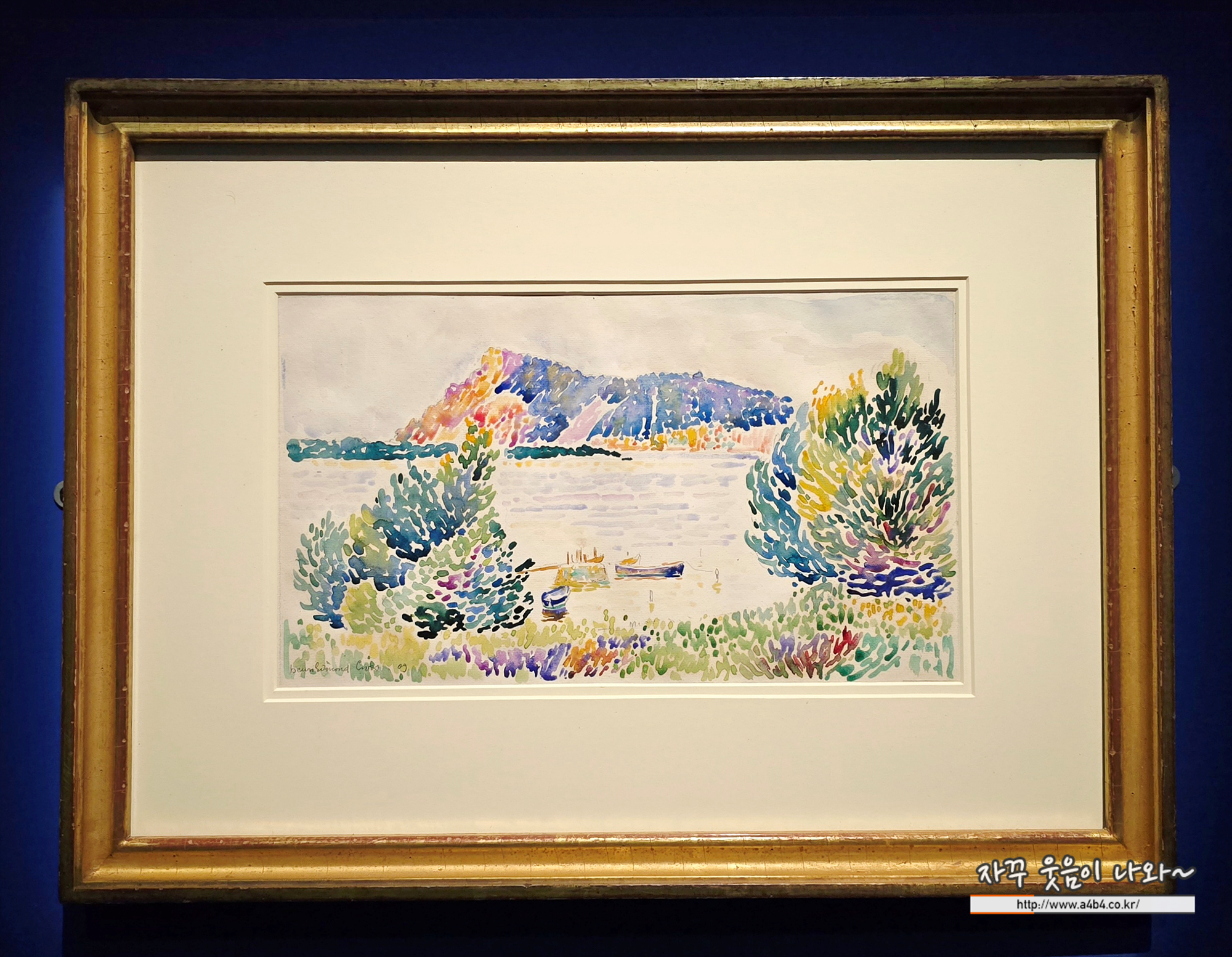 찬란한 색채로 채워진 이 작품은 앙리 에드몽 크로스가 1910년 생전에 남긴 마지막 지중해 풍경화다. 그는 수채화 효과를 능숙히 활용해 하늘과 바다에는 옅은 색을 얇게 바르고, 앞쪽의 나무·풀밭·먼 산에는 보석처럼 선명한 색을 두껍게 올려 극적인 대비를 만들었다. 종이의 흰 바탕을 남겨 붓질이 흰 여백에 감싸이도록 표현해, 풍경이 빛에 둘러싸인 듯 밝고 산뜻한 분위기를 준다.