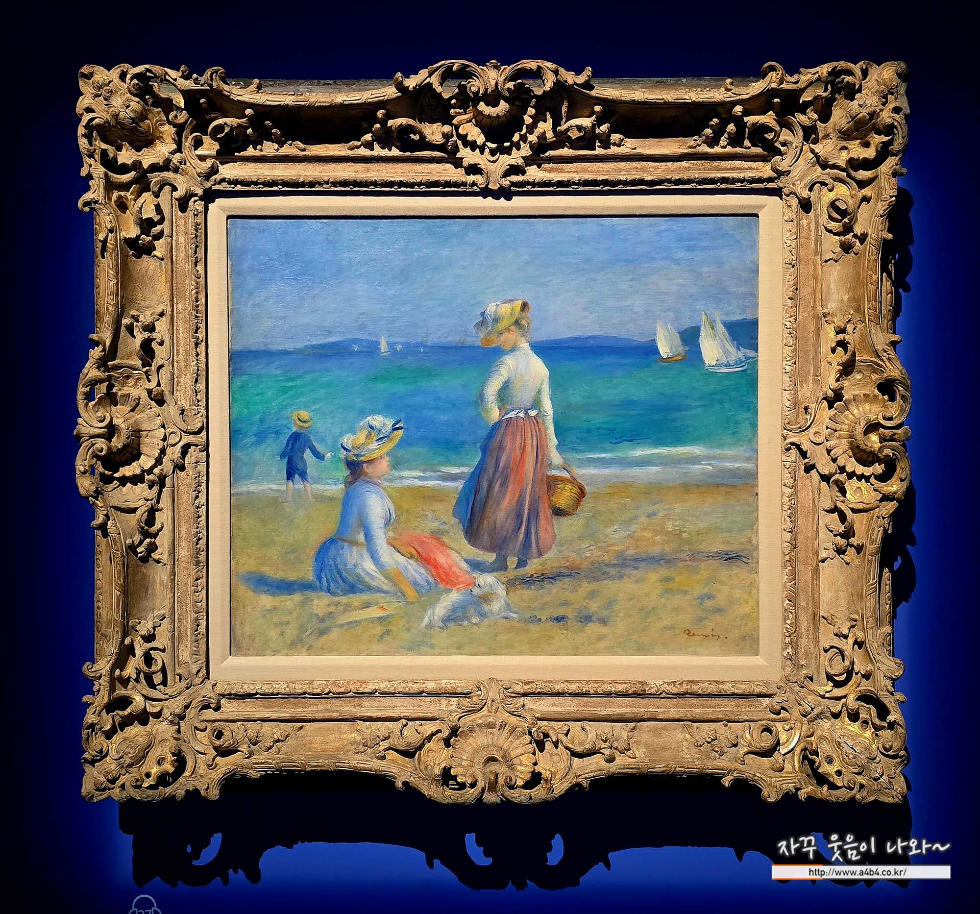 햇살이 가득한 이 장면은 프랑스 남부 해안에서 즐기는 소박한 여름날의 기쁨을 담고 있다. ‘코트다쥐르(Côte d’Azur)’는 ‘푸른 해안’이라는 뜻으로, 지중해 특유의 짙은 푸른빛을 가리킨다. 이 작품에서는 하늘·바다·땅 곳곳에 서로 다른 푸른빛이 어우러져 전체적으로 푸른 해안의 분위기가 형성된다. 르누아르는 활기찬 색감과 섬세한 붓질을 활용해 바닷가 풍경을 생동감 있게 표현했다.