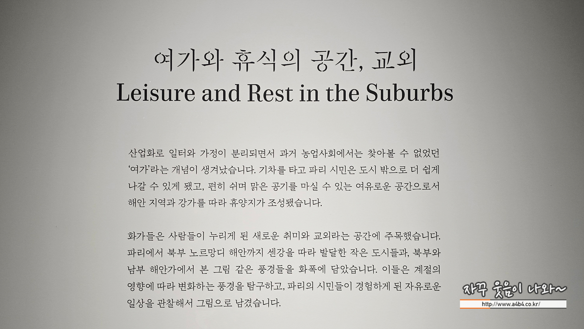 화가들은 새롭게 등장한 취미 생활과 교외 공간에 주목했다. 파리에서 노르망디 해안까지 센강을 따라 자리한 작은 도시들, 그리고 북부·남부 해안 풍경을 화폭에 담았다. 계절에 따라 바뀌는 풍경을 관찰하고, 파리 시민들이 누리게 된 자유로운 일상을 그림으로 기록했다.