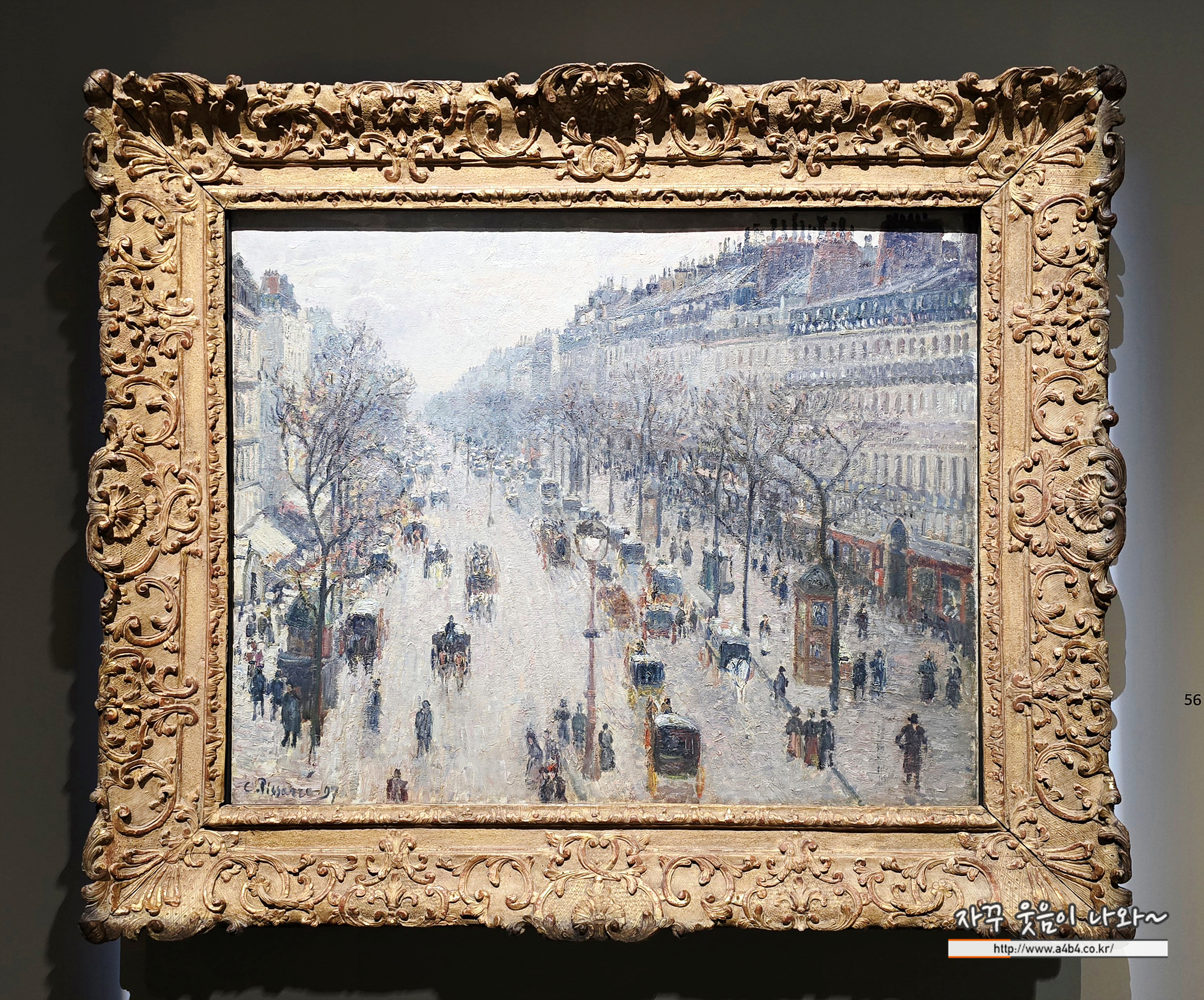 카미유 피사로는 1890년대 들어 파리의 근대적 도시 생활을 집중적으로 그렸다. 그는 19세기 중반 재개발로 새로 조성된 파리의 대로를 주제로, 날씨와 시간대에 따라 변화하는 모습을 담은 연작 14점을 완성했다. 이 작품은 그중 하나로, 겨울 아침의 차가운 빛과 앙상한 가로수가 거리를 감싸고 있다. 아침부터 분주히 오가는 마차와 사람들은 고요한 도시에 생동감을 더한다.
