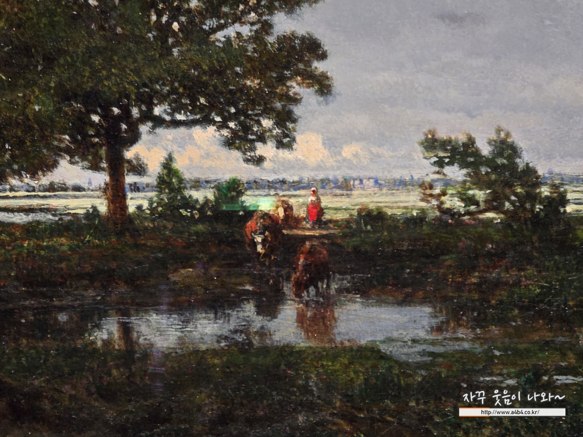 연못가에서는 소들이 물을 마시고, 수면에는 소와 나무, 하늘의 그림자가 비친다. 자연의 소박한 장면을 담은 차분한 구도는 고요하고 사색적인 분위기를 자아낸다.