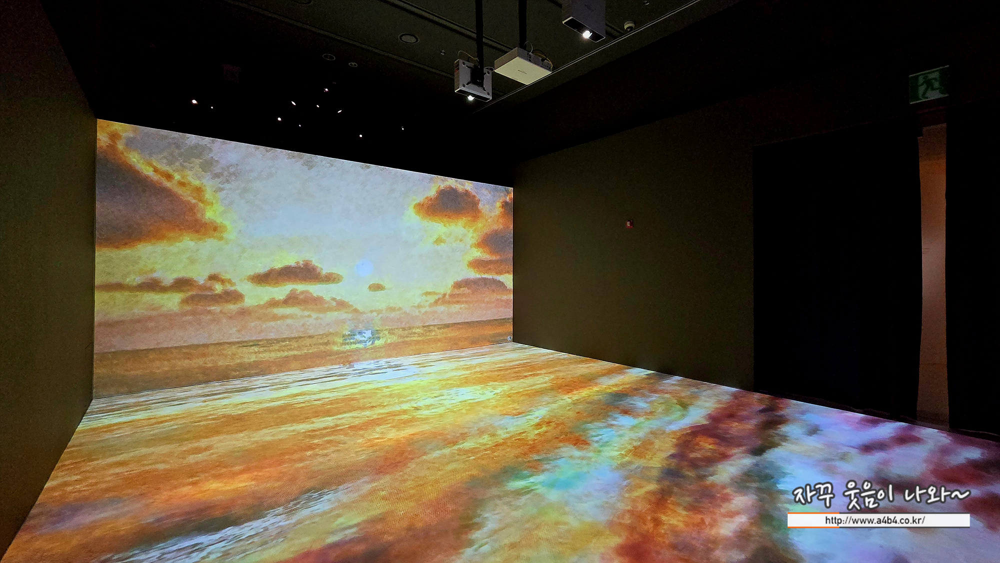 전시장 뒷편에는 마치 바닷물이 흘러내리는듯한 벽면과 의자가 세팅되어 있습니다. 여기에 앉아서 건너편 작품 감상하면서 휴식이 가능합니다.