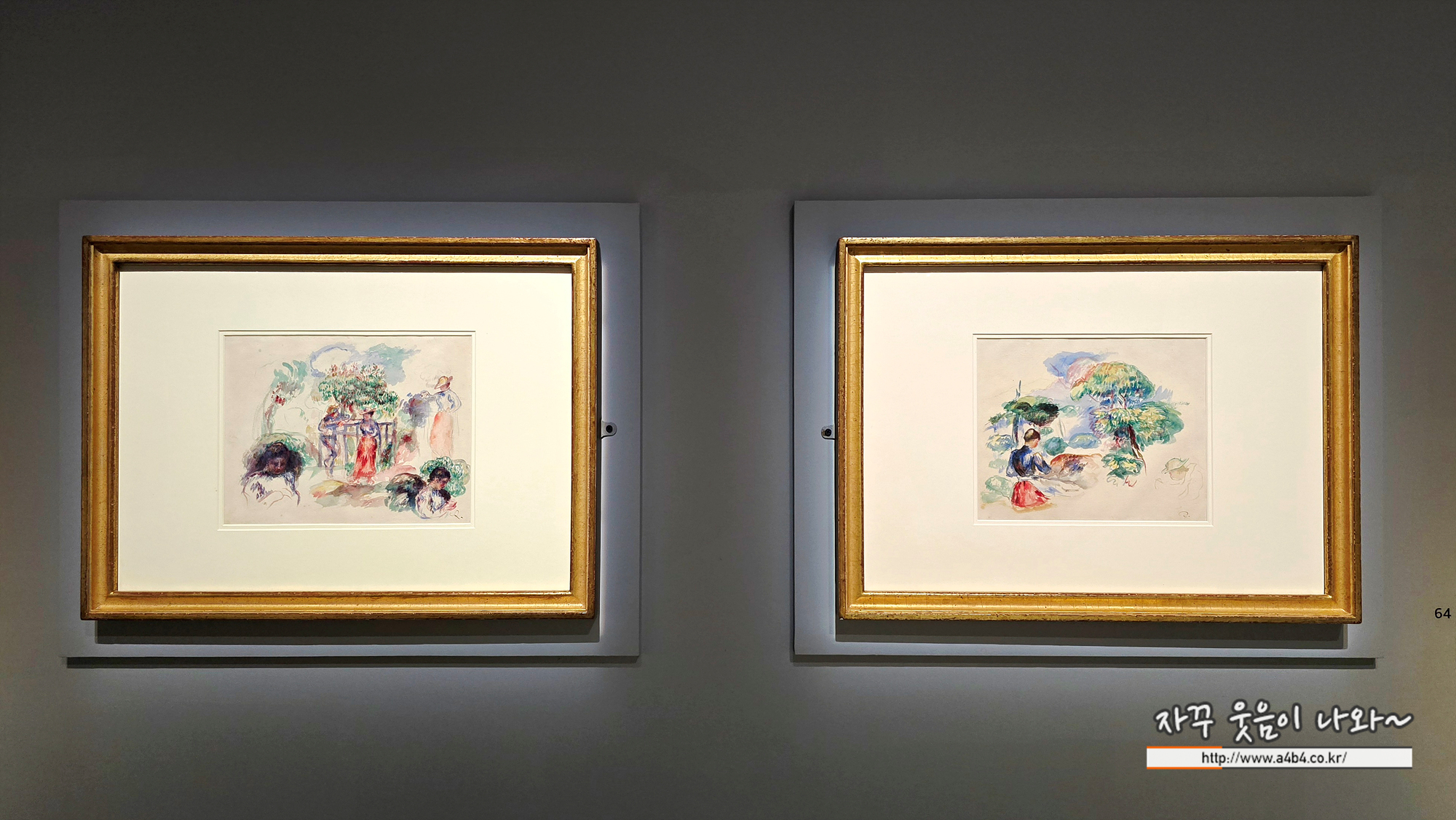 오귀스트 르누아르는 이처럼 다양한 여가를 즐기는 사람들의 모습을 기록했다. 그는 가벼운 연필 밑그림 위에 투명한 수채 물감을 빠르게 칠해, 마치 사진처럼 일상의 순간을 자연스럽게 담아냈다.