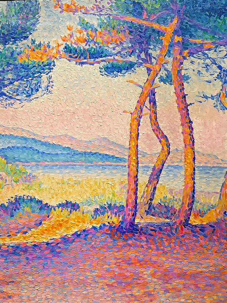 앙리 에드몽 크로스는 1890년대 프랑스 남부에 정착해 지중해의 밝은 풍경을 주요 주제로 삼았다. 이 작품에서는 서로 섞이지 않는 선명한 색점을 반복해 찍는 점묘법을 사용했다. 앞쪽 그늘과 먼 언덕은 보라·푸른 계열의 시원한 색조로, 햇빛이 닿는 부분은 노랑·주황의 따뜻한 색조로 대비를 이루게 했다. 인간의 손길이 미치지 않은 듯한 순수한 자연 풍경이 인상적으로 펼쳐진다.