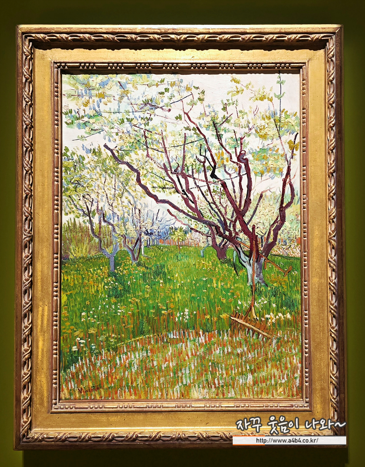 1888년 빈센트 반 고흐는 2년간의 파리 생활을 마치고 프랑스 남부로 이동했으며, 이 작품은 그가 아를에서 그린 초기 연작 중 하나다. 그는 구불구불한 고목에 꽃이 피는 남부 특유의 풍경을 관찰하며, 강렬한 태양 아래의 선명한 색감과 자신만의 뚜렷한 붓 자국을 강조하는 표현에 집중했다. 나무에 걸쳐진 긴 자루 낫과 갈퀴는 근처에 사람이 있음을 암시한다.