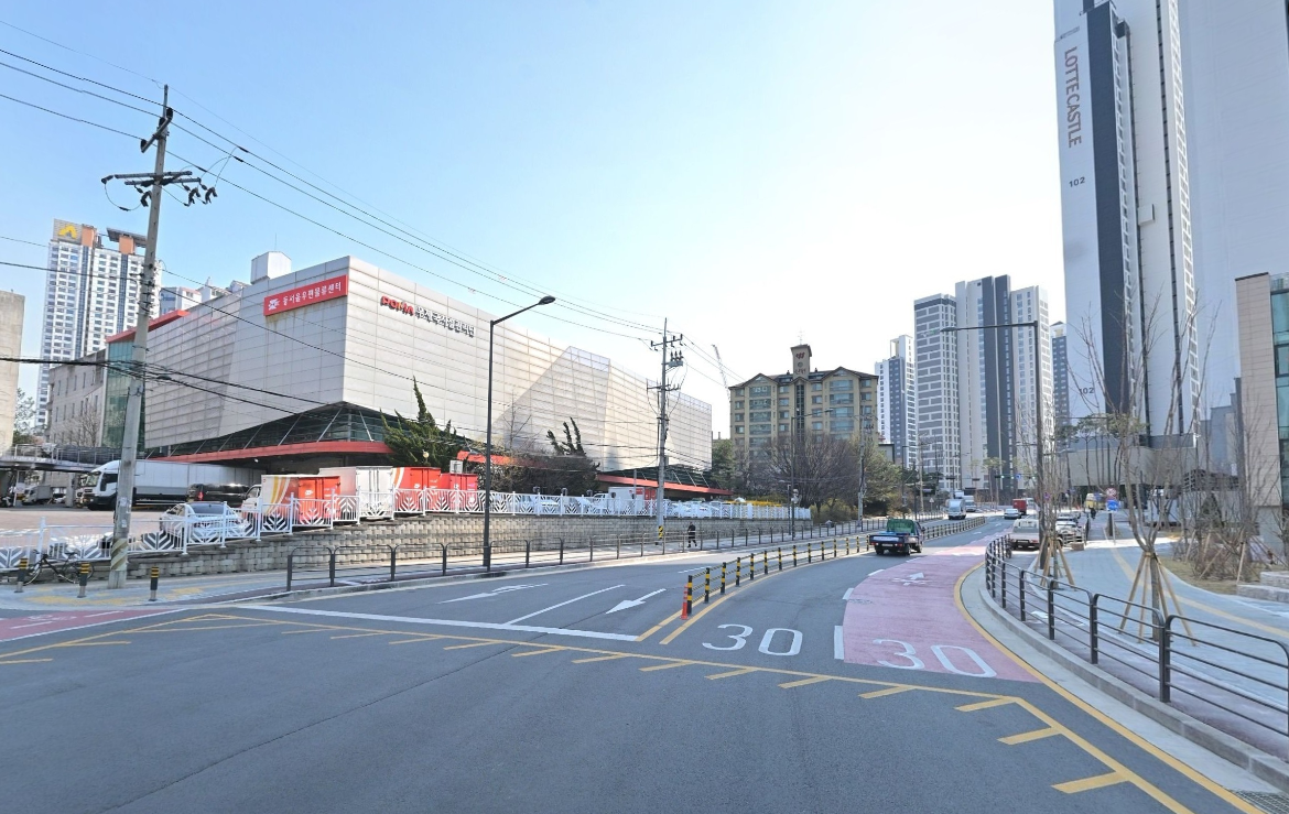 고가차도 아래 동서울우편물류센터를 끼고 좌회전 하게 됩니다. 좌에는 우체국 우에는 롯데캐슬 건물이 보이는...