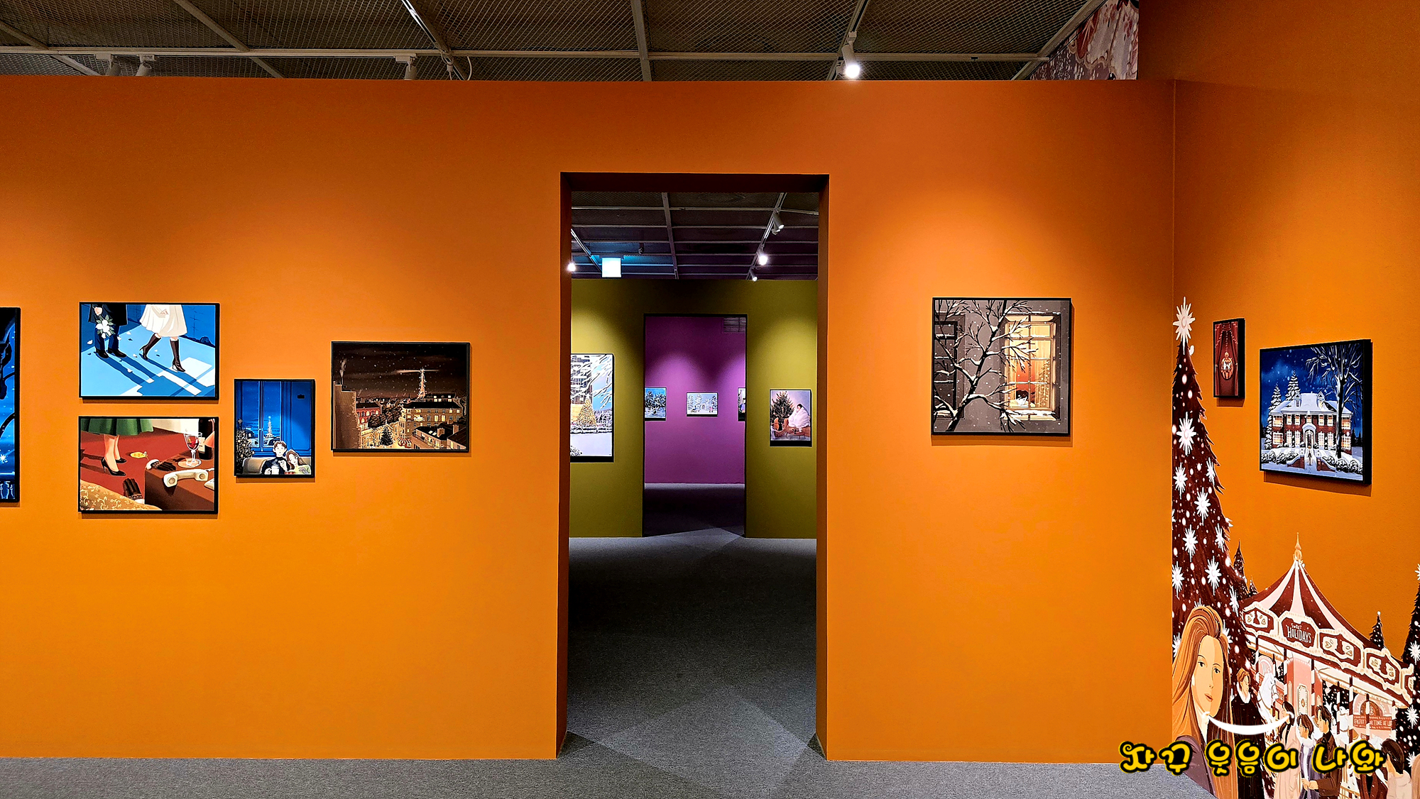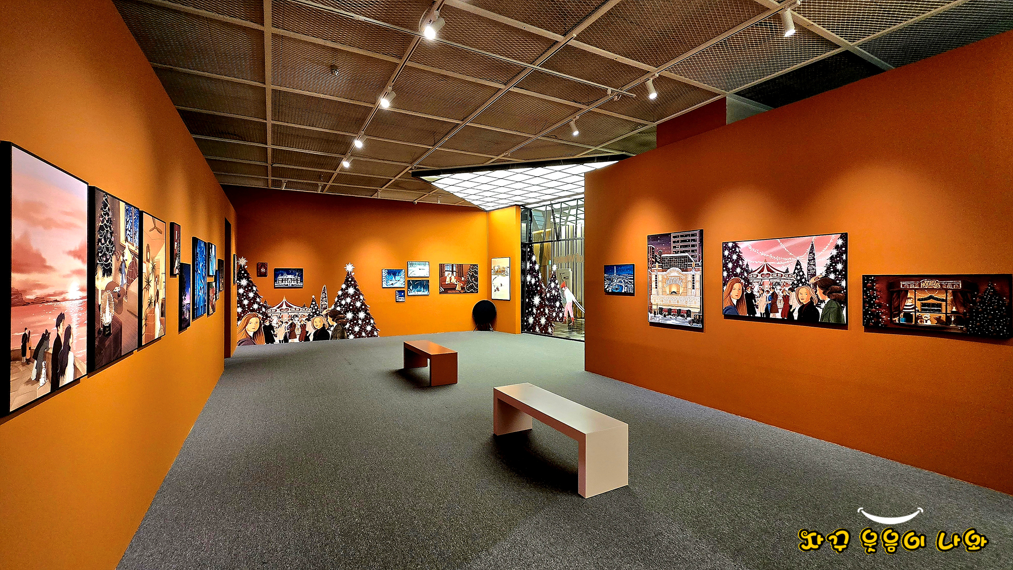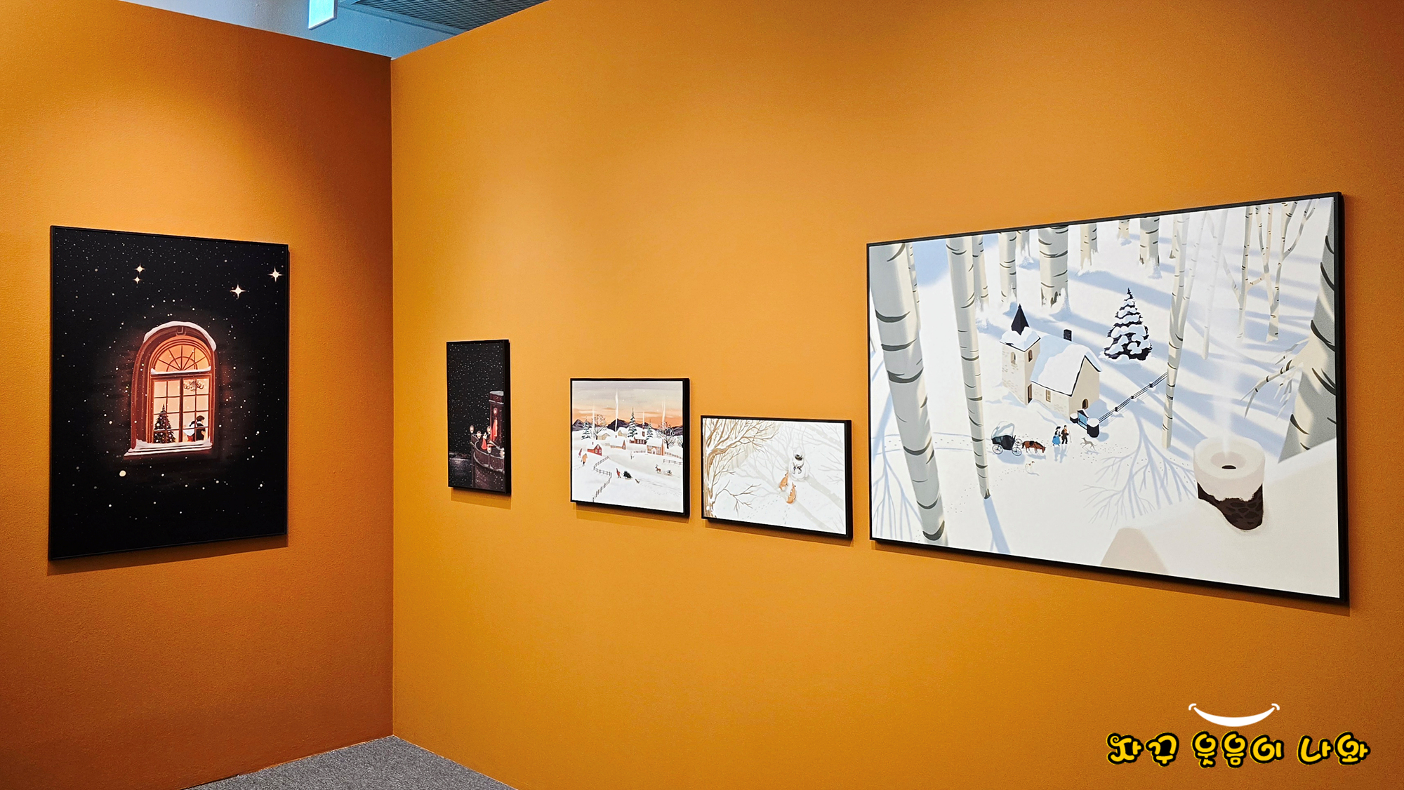 겨울,그 따뜻한 순간들 전시회 전시장 구성은 중앙에 대형 포토월이 설치되어 있고 수빈, 배성규, 아레아레아 작가 3명의 작품이 전시된 각각이 방으로 구성되어 있습니다. 어느 방부터 먼저 들어가도 방은 모두 연결되어 있고요. 배성규 작가 또는, 아레아레아 작가 방에서 시작하시면 연속해서 관람이 가능합니다.