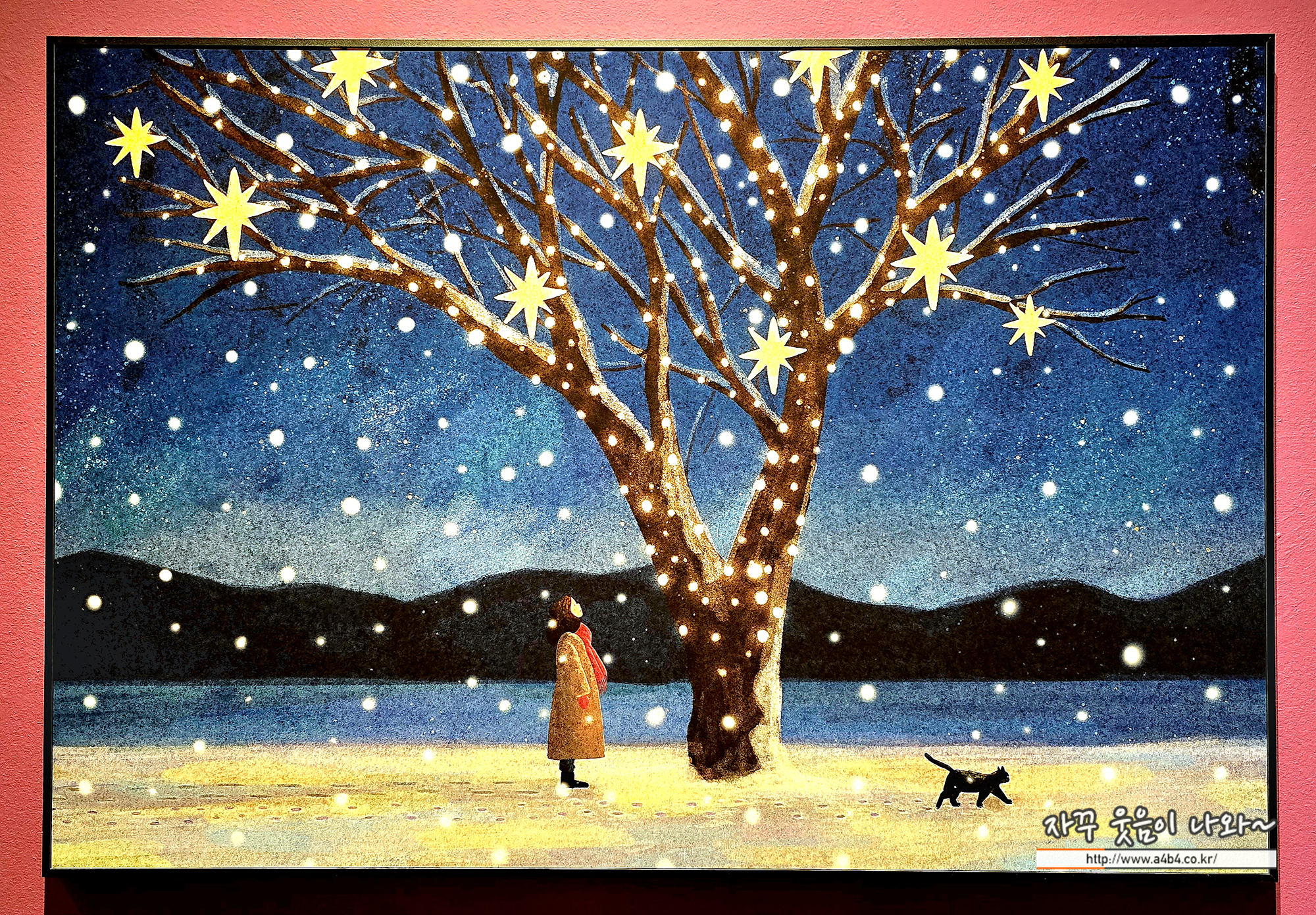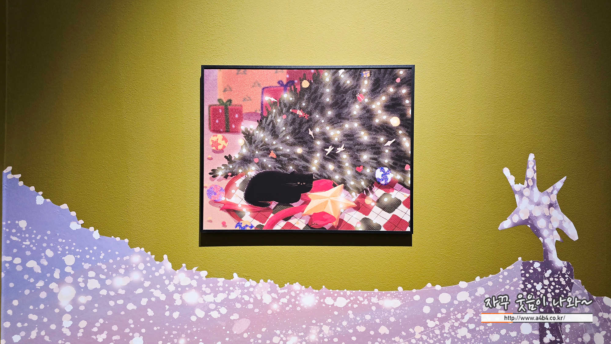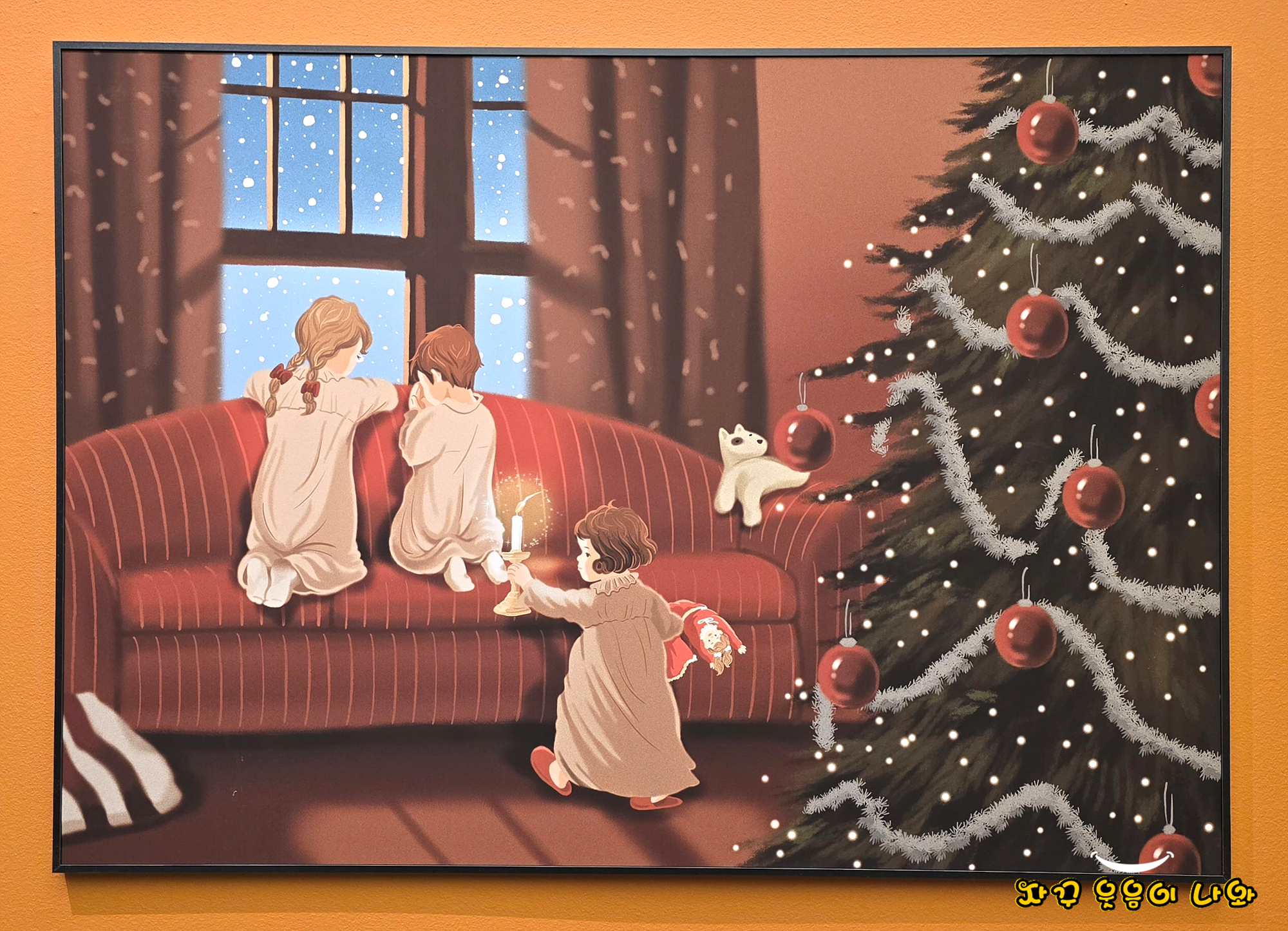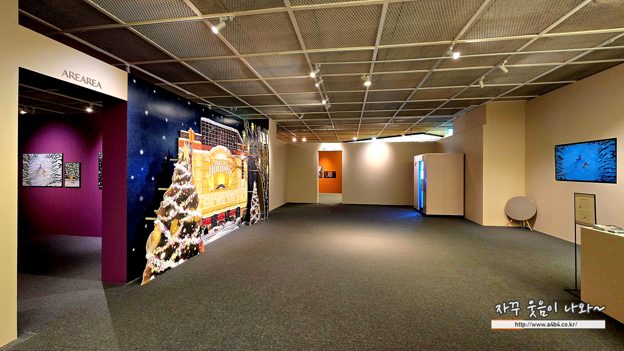 겨울,그 따뜻한 순간들 전시회 전시장 구성은 중앙에 대형 포토월이 설치되어 있고 수빈, 배성규, 아레아레아 작가 3명의 작품이 전시된 각각이 방으로 구성되어 있습니다. 어느 방부터 먼저 들어가도 방은 모두 연결되어 있고요. 배성규 작가 또는, 아레아레아 작가 방에서 시작하시면 연속해서 관람이 가능합니다.