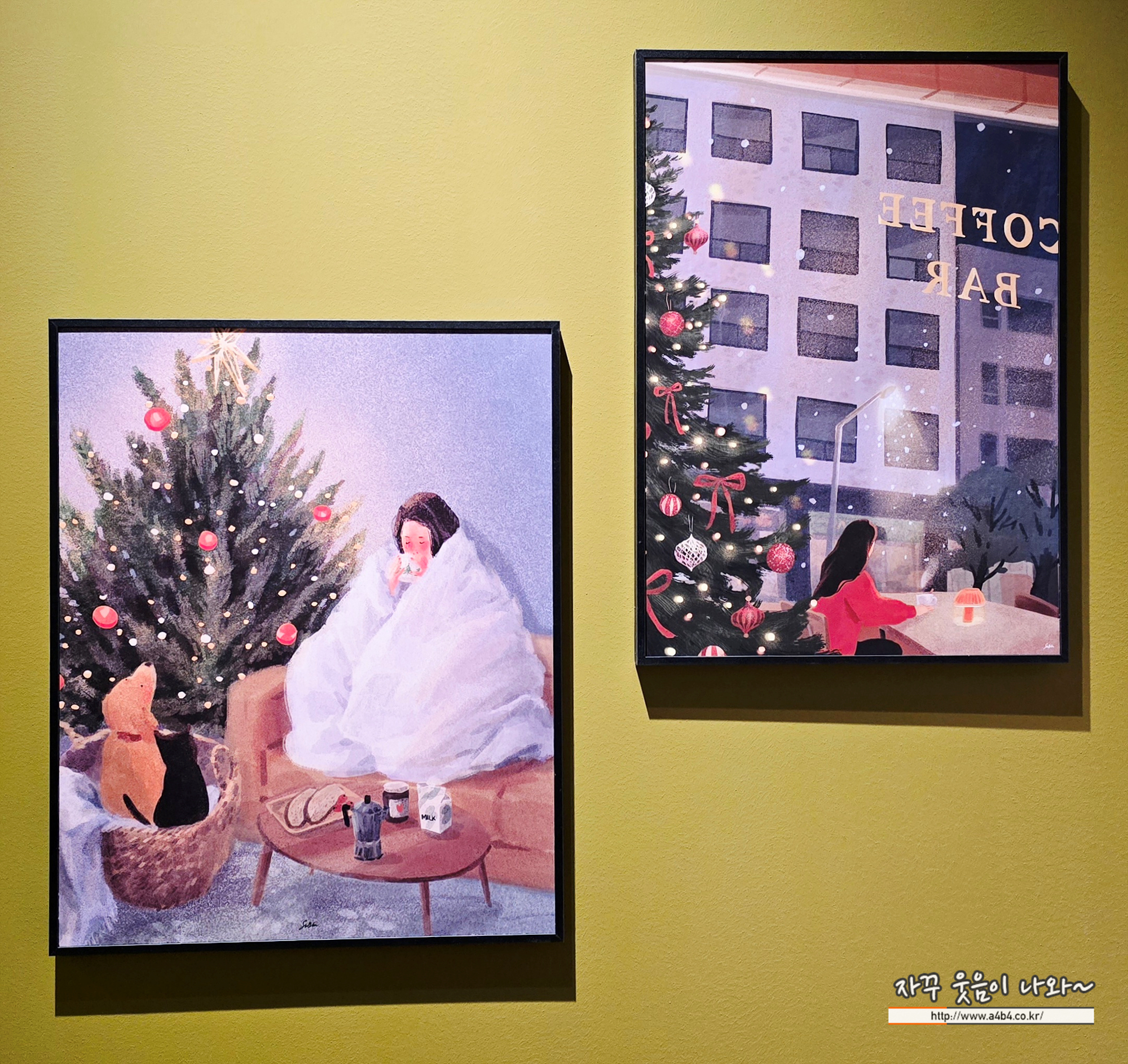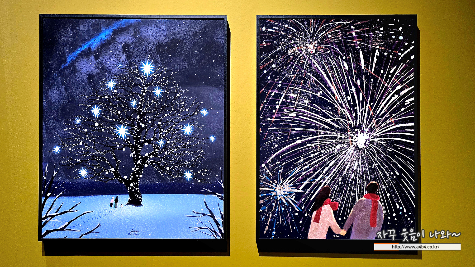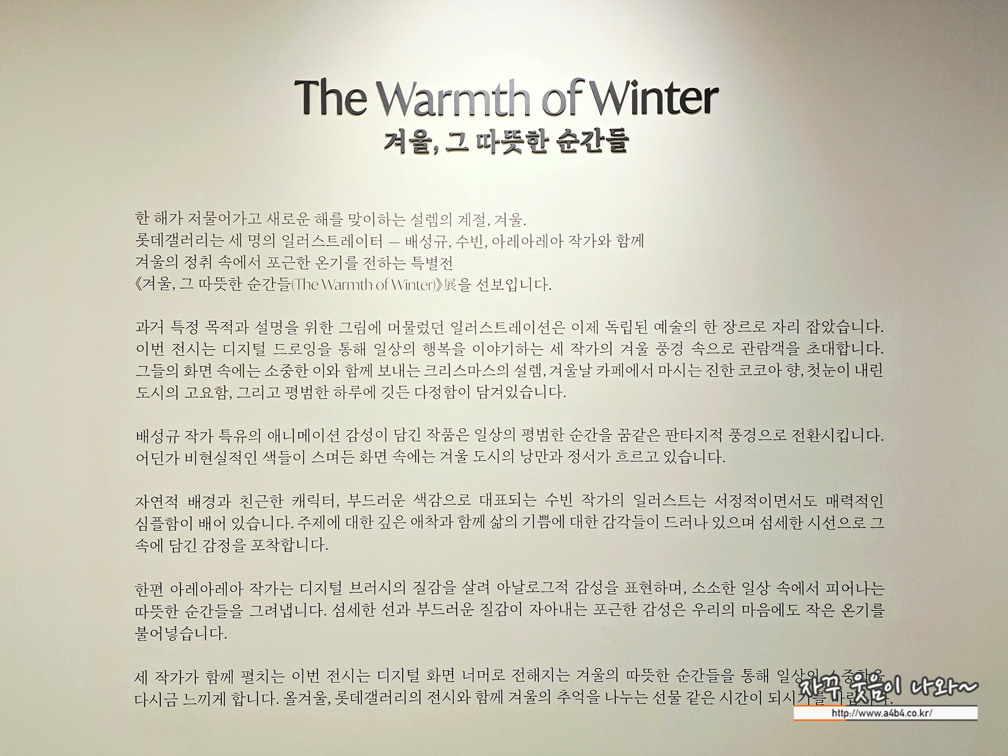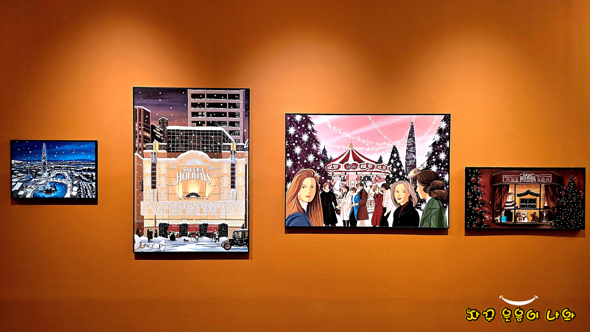 지난주 금요일부터 잠실 롯데월드몰 6층에 위치한 에비뉴엘아트홀 전시회 '겨울,그 따뜻한 순간들' 관람후기 입니다. 이번 전시회는 겨울을 주제로 국내에서 활발하게 활동하고 있는 일러스트레이터 3인의 작품을 만나볼 수 있습니다.