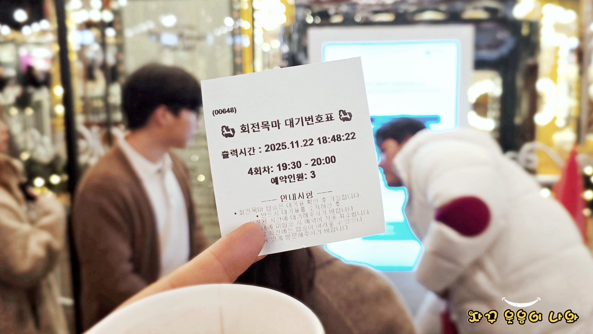 사진과 같이 출력시간 18:48분 탑승 가능시간 19:30분 입니다. 웨이팅은 약 20분 정도 한 것 같고요. 즉 회전목마 타려면 1시간 대기는 필요하니, 입장하면 가장 먼저 해야할 일중에 하나가 바로 회전목마 예약입니다.