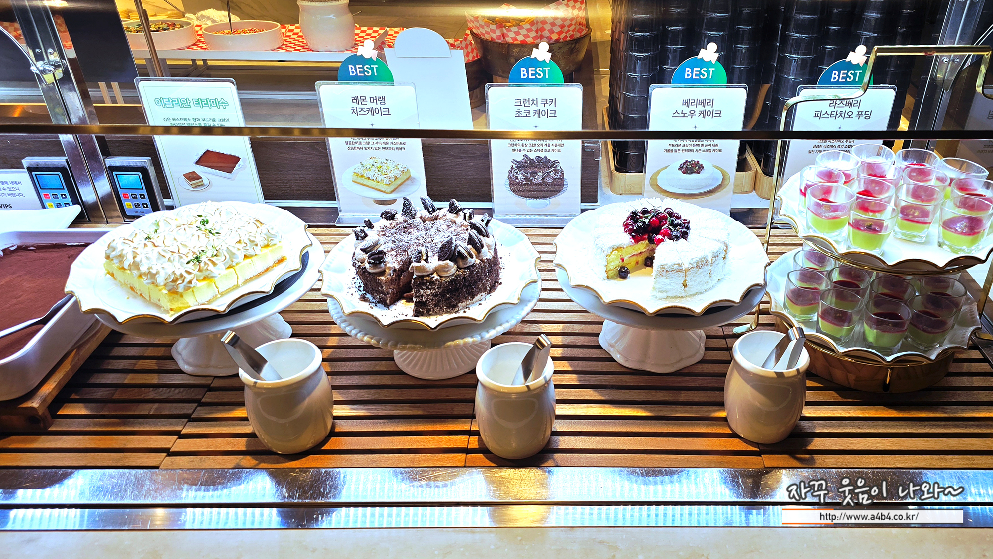 케이크 4종과 푸딩 1, 과일과 탄산음료, 아이스크림, 커피 있네요.