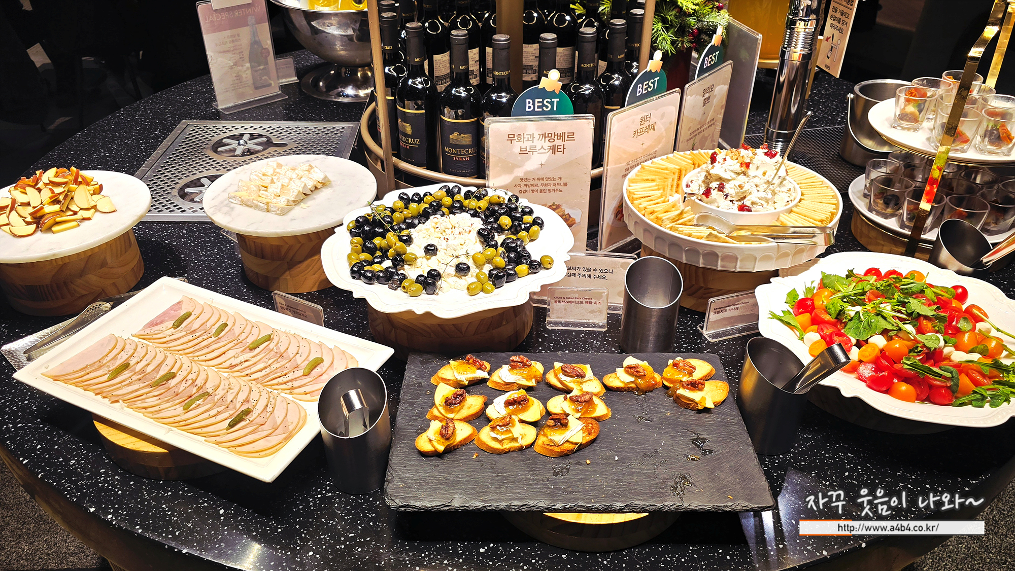 맥주와 와인 안주로는 무화과 까망베르 브루스케타, 윈터 카프레제, 알리오 뽈뽀, 카니페, 여러 치즈와 햄이 세팅되어 있습니다.