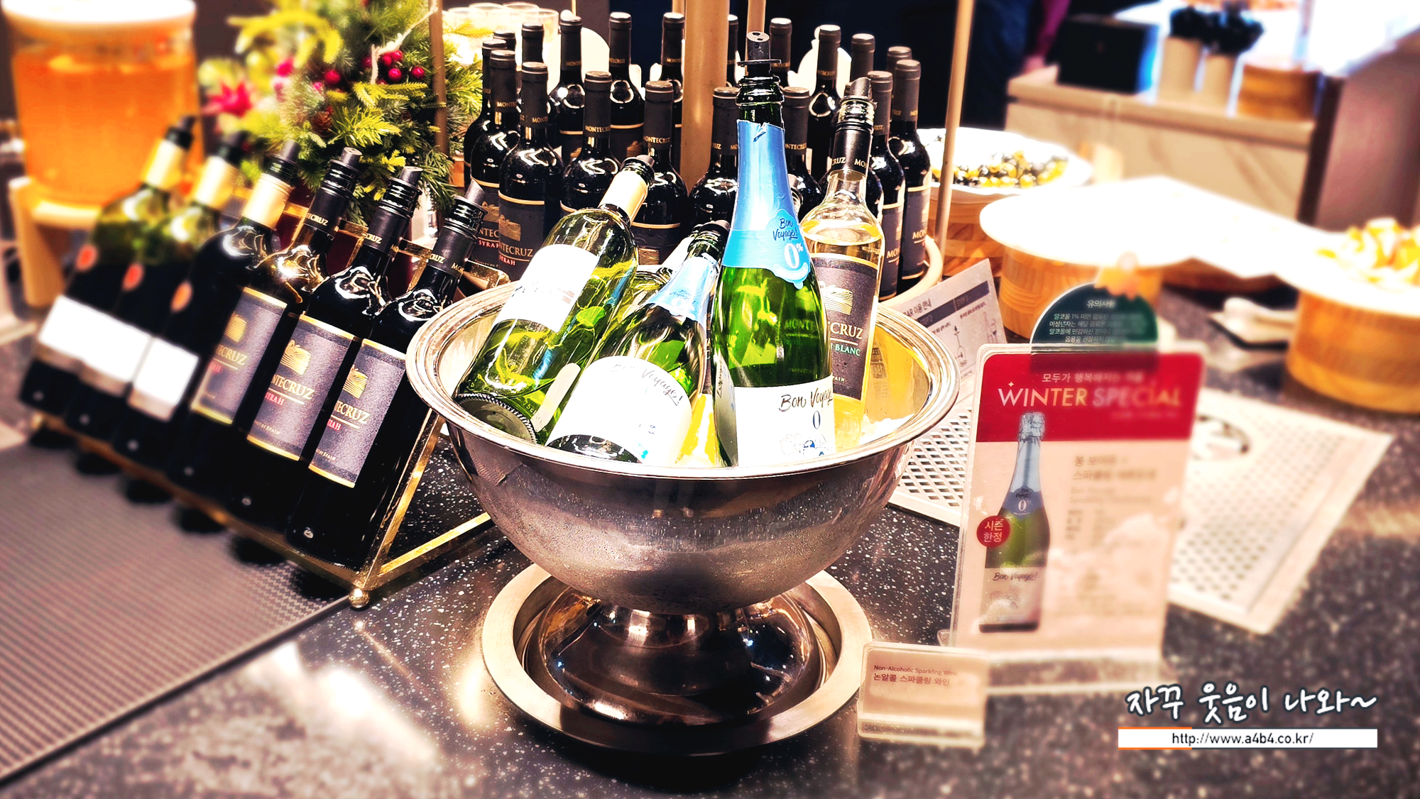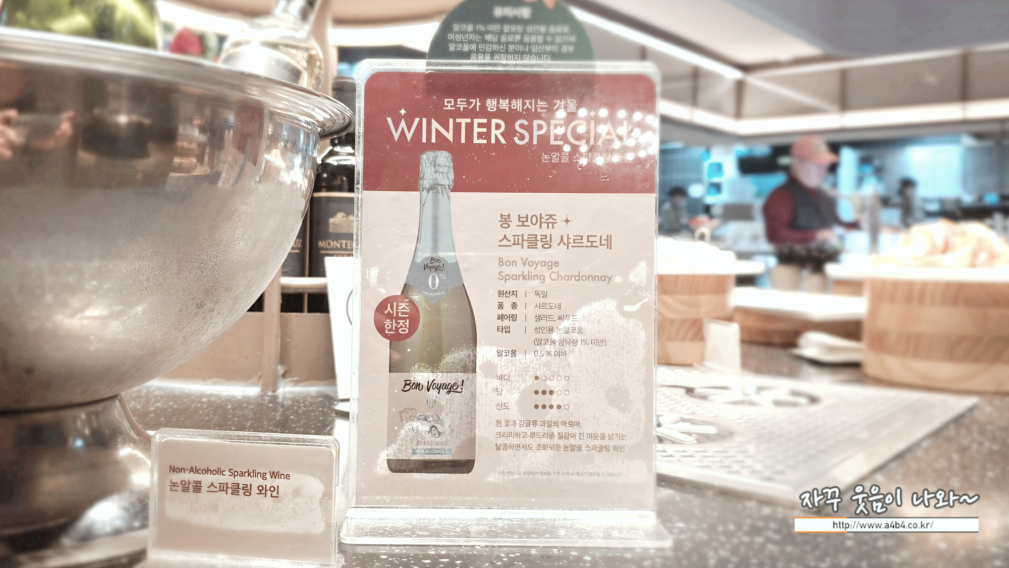 독일 무알콜 와인 봉 보야주 스파클링 샤르도네 (Bon Voyage Sparkling Chardonnay)가 세팅되어 있는데요. 과실향 강한 와인이라기 보다는 음료수에 가깝네요.