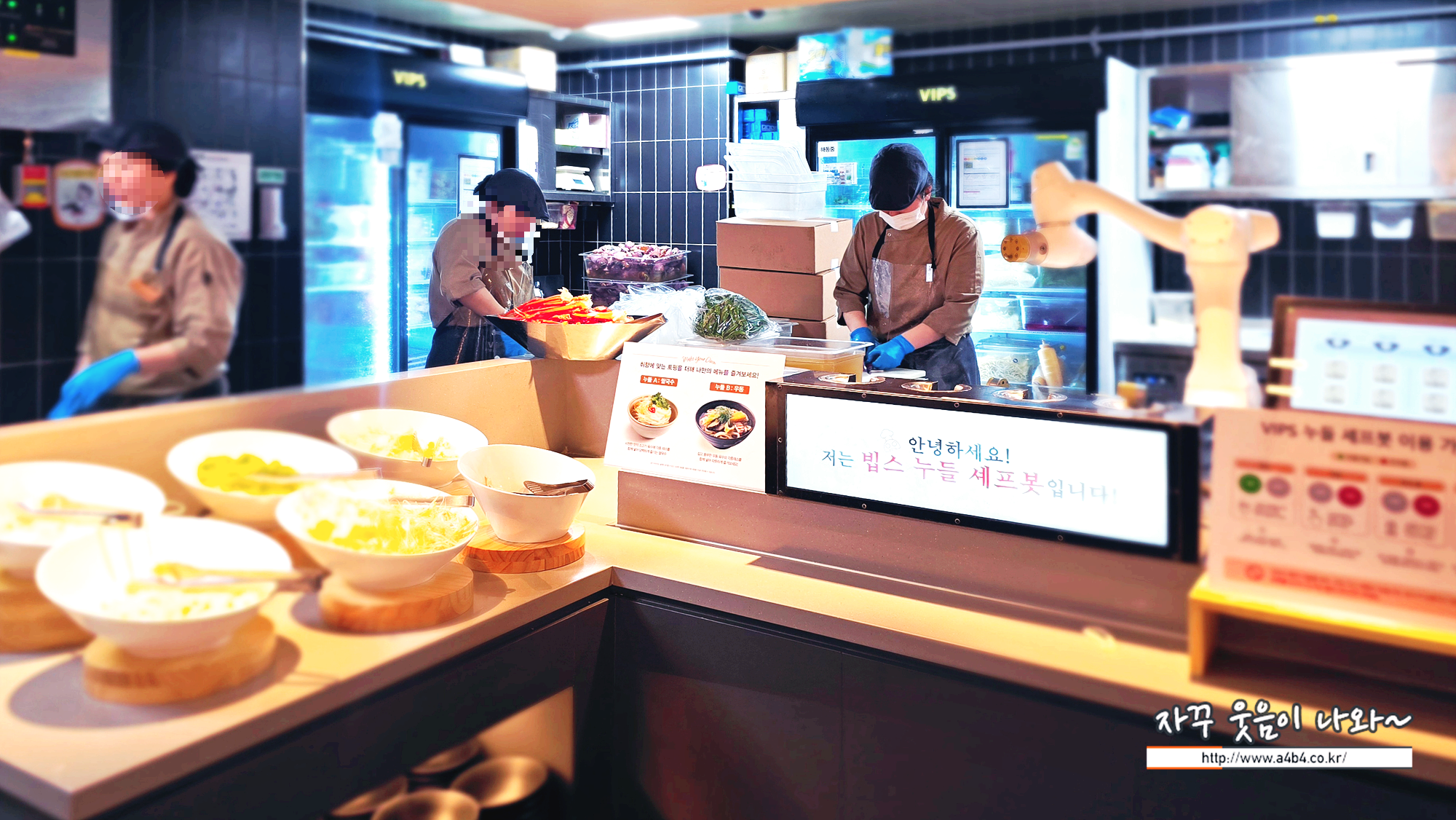 다음 코너는 빕스 누들코너입니다. 즉석으로 취향에 맞춰 우동이나 쌀국수 조합이 가능한데요. 로봇이 조리해 줍니다.