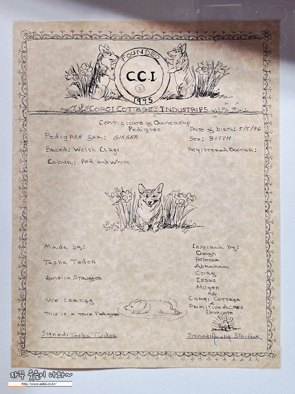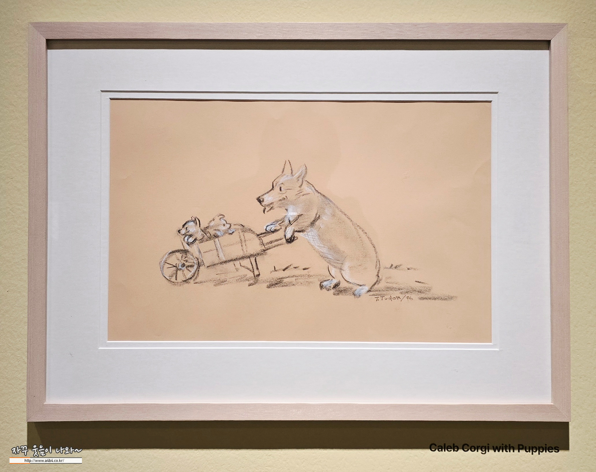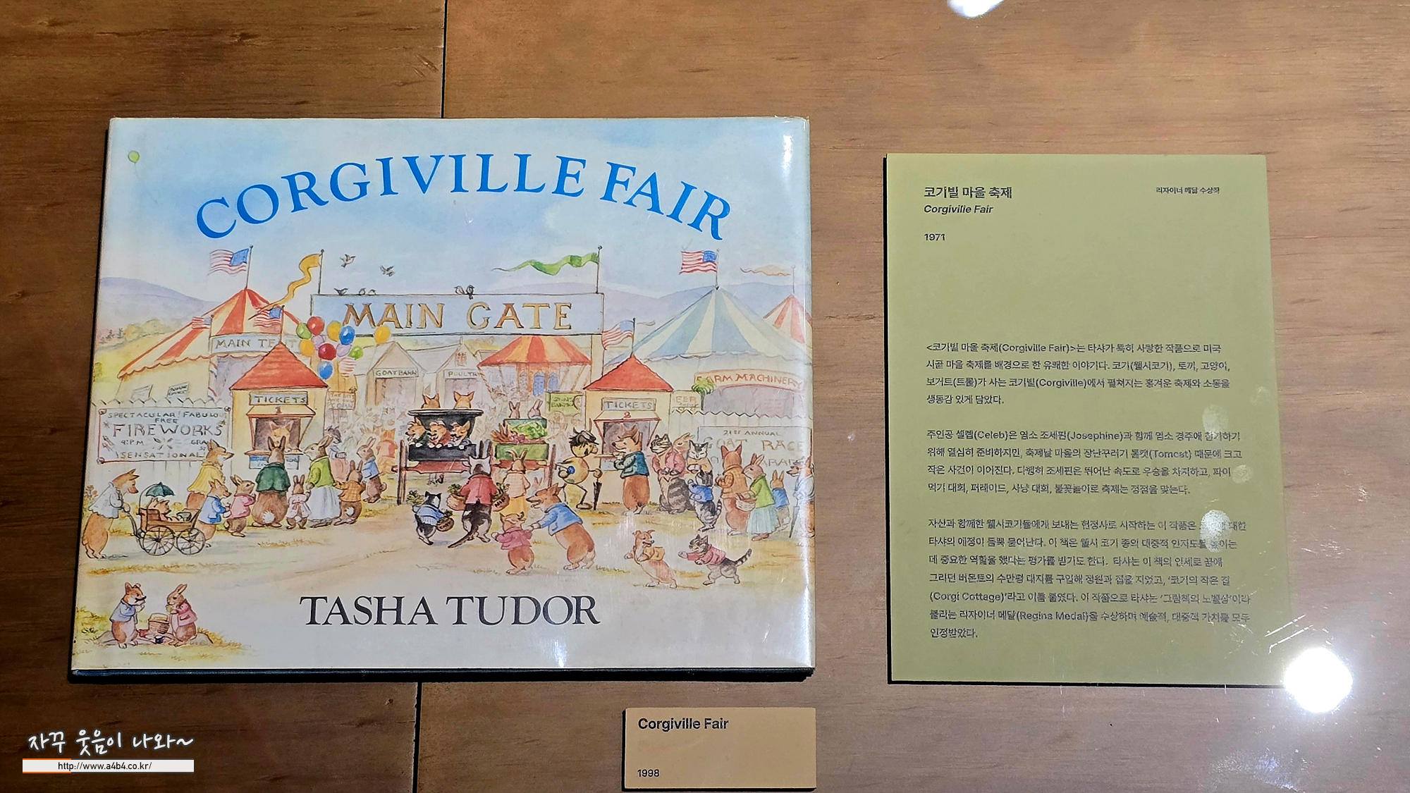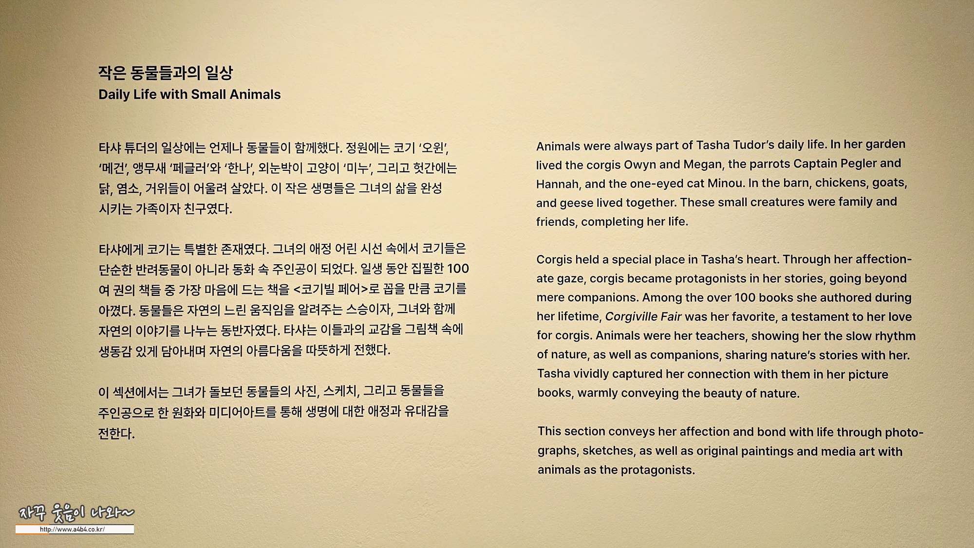 타샤 튜더가 키운 개는 펨브록 웰시 코기였으며, 첫 코기는 아들 톰이 영국 기숙학교에서 구입해 나무 상자에 실어 보낸 개로, 이후 그녀는 많을 때는 열네 마리까지 코기를 키우며 평생을 함께했고, (도슨트에서는 30마리로 기억)이 애정은 코기들이 사는 마을을 그린 그림 Corgiville Fair(코기빌 마을 축제)와 다양한 작품·굿즈 속에 반복적으로 나타납니다
