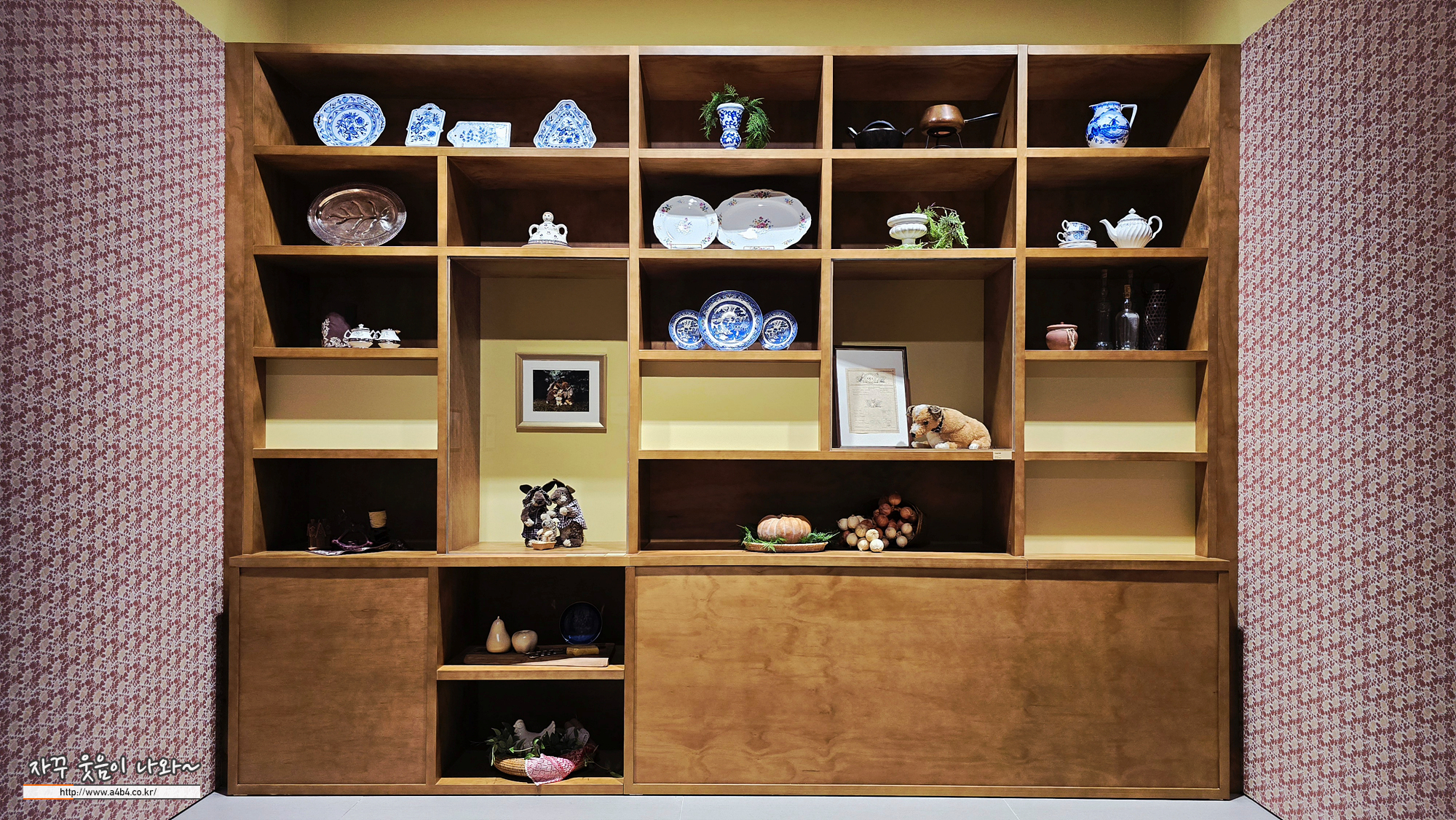 작품 뒷쪽으로는 큰 책장속에 여러 자기와 인형들이 전시되어 있습니다.+