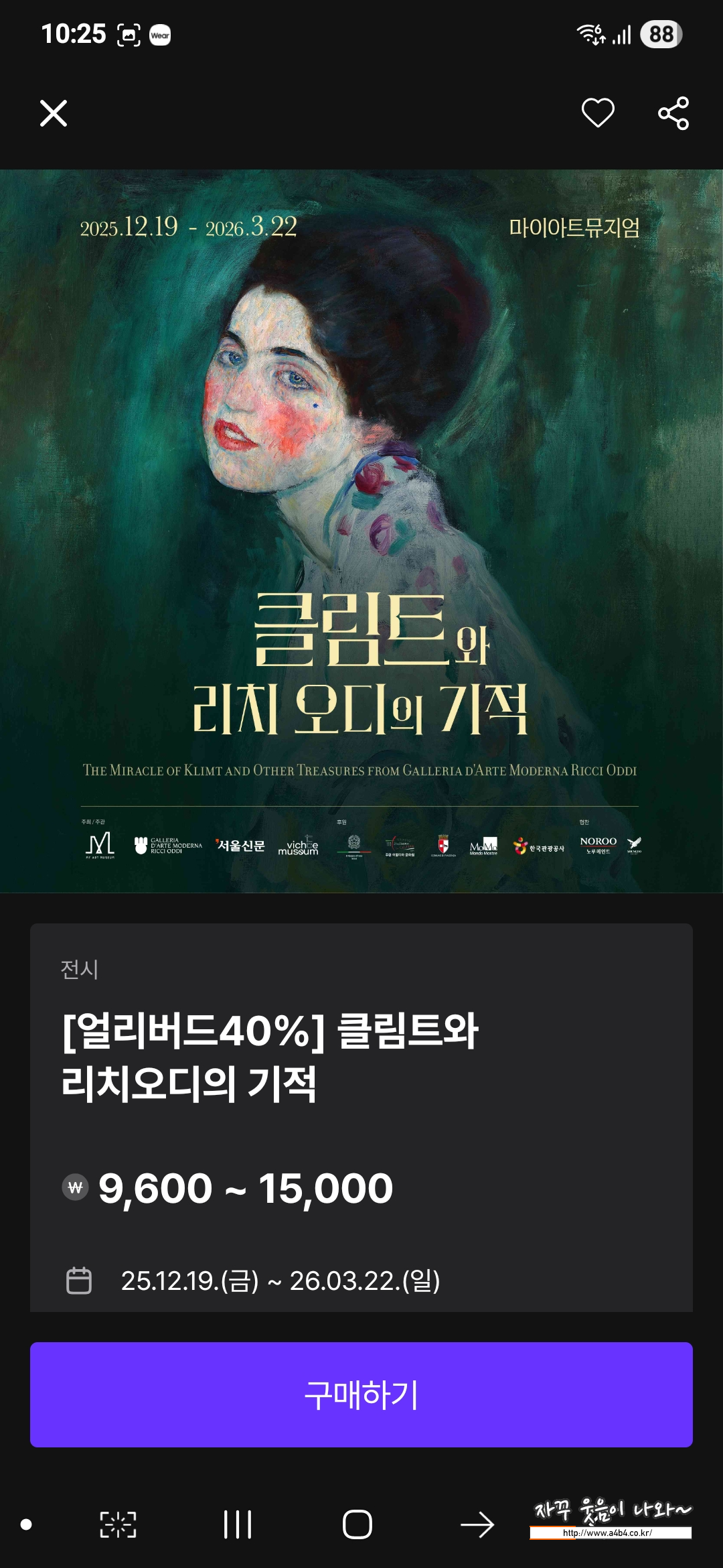 저는 전시회 오픈전 클림트와 리치오디의 기적 얼리버드 티켓팅을 통해 40% 할인된 가격에 관람했습니다. 현재 클림트 전시회 할인티켓 검색에서 나오는 결과는 이미 종료된 상품이네요.