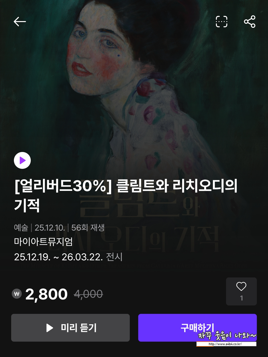 이번 클림트와 리치오디의 기적: 이탈리아 리치오디 현대미술관 컬렉션 전시회 오디오가이드는 유료로 제공됩니다. 큐피커 앱에서 사용할 수 있는데요. 클림트와 리치오디의 기적 오디오가이드 가격은 4,000원 입니다.