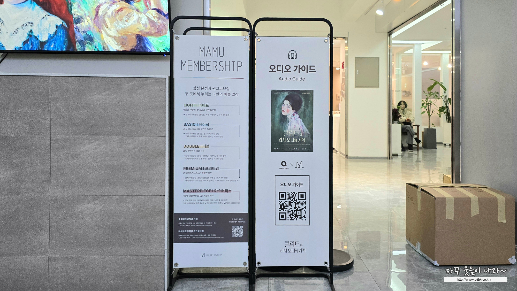 이번 전시회도 지난 마이아트뮤지엄과 동일한 수준으로 도슨트가 진행됩니다. 정우철, 이지안, 한지원 도슨트님들이 로테이션으로 평일 하루 3회 11시 14시, 16시 도슨트가 진행 됩니다. (공휴일과 토요일, 일요일은 클림트와 리치오디의 기적 전시회 도슨트는 진행하지 않습니다.) 토요일에 방문하니 도슨트 안내 현수막은 뒷편에 숨겨 있네요.