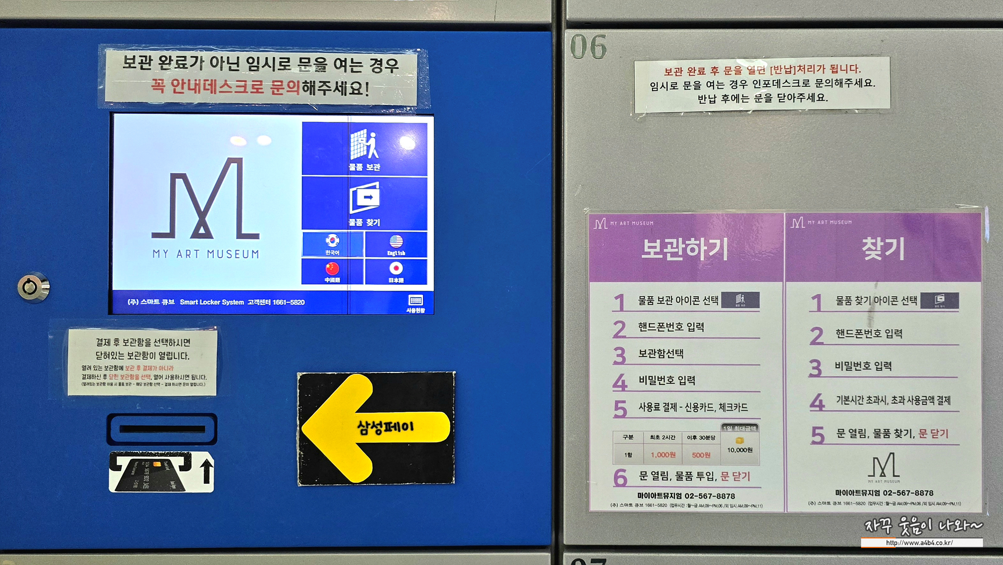 마이아트뮤지엄 물품보관함은 유료로 운영되는데요. 1,000원에 2시간 이용가능합니다.