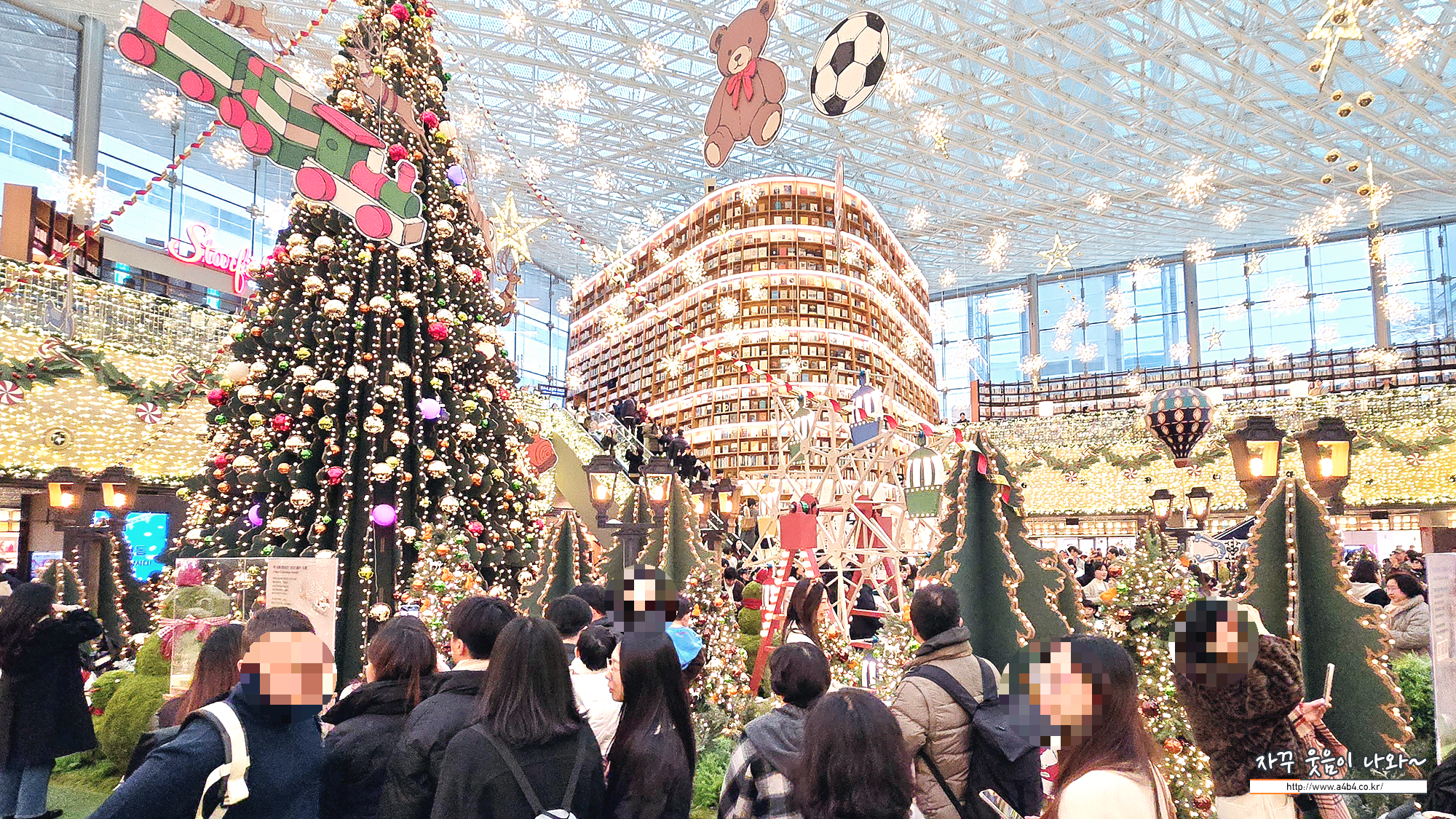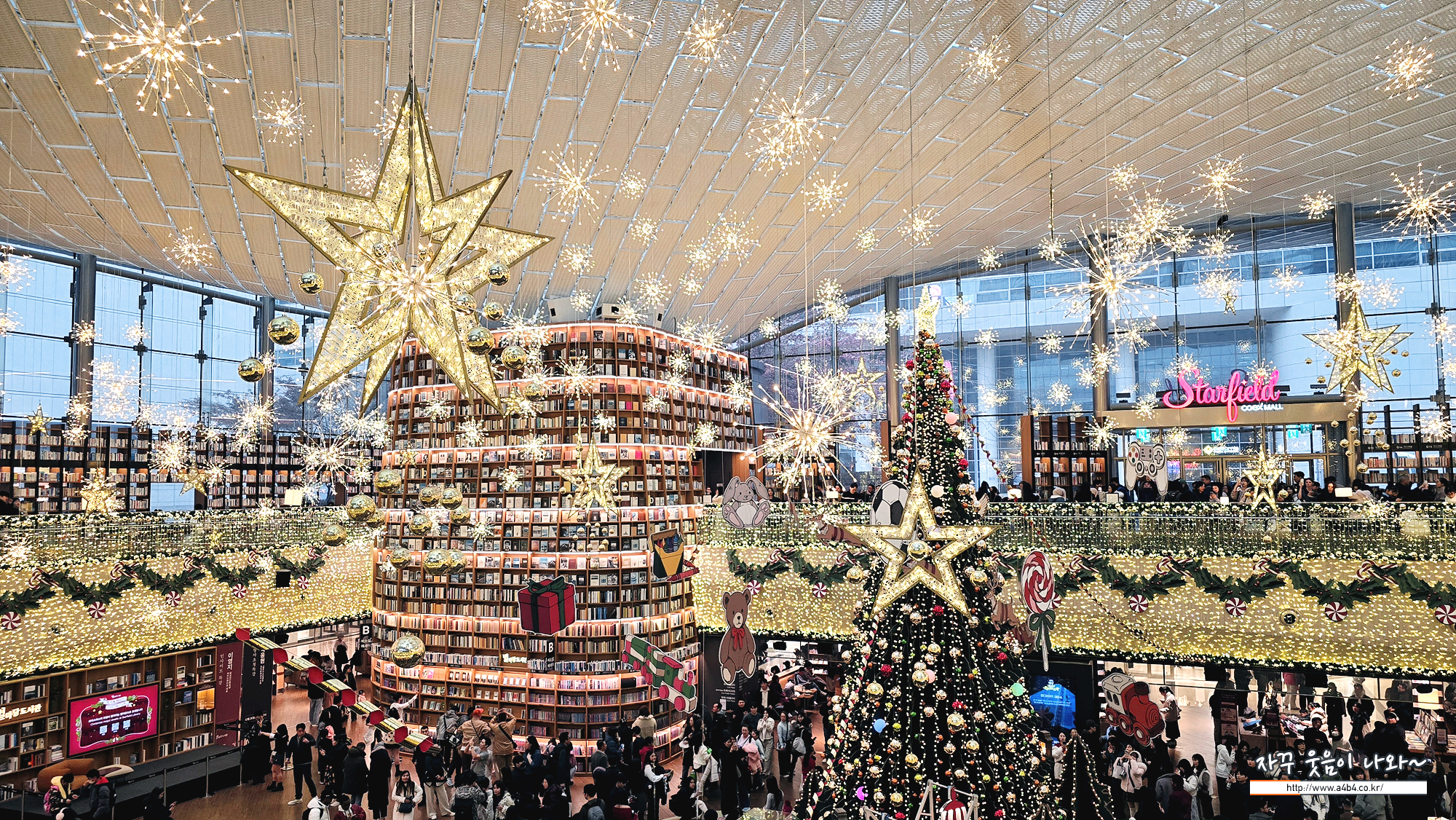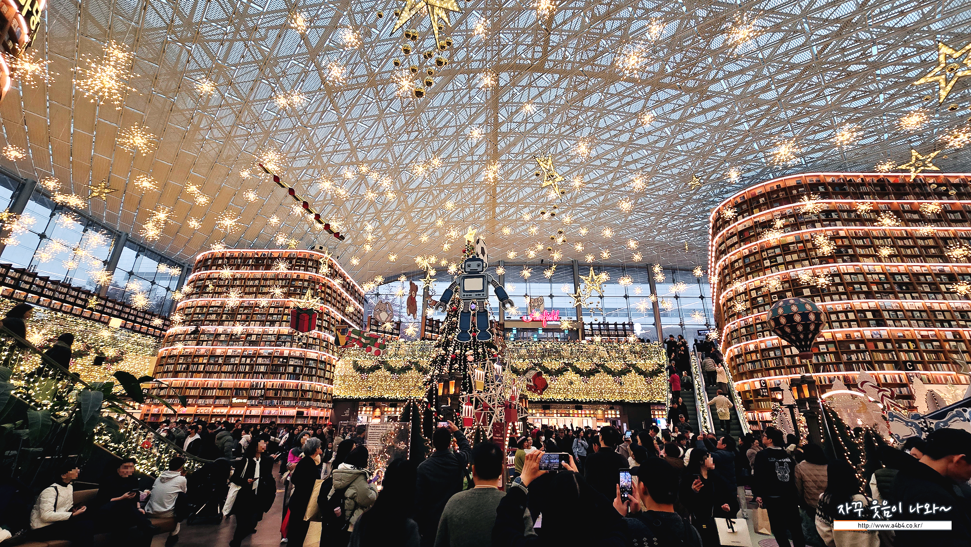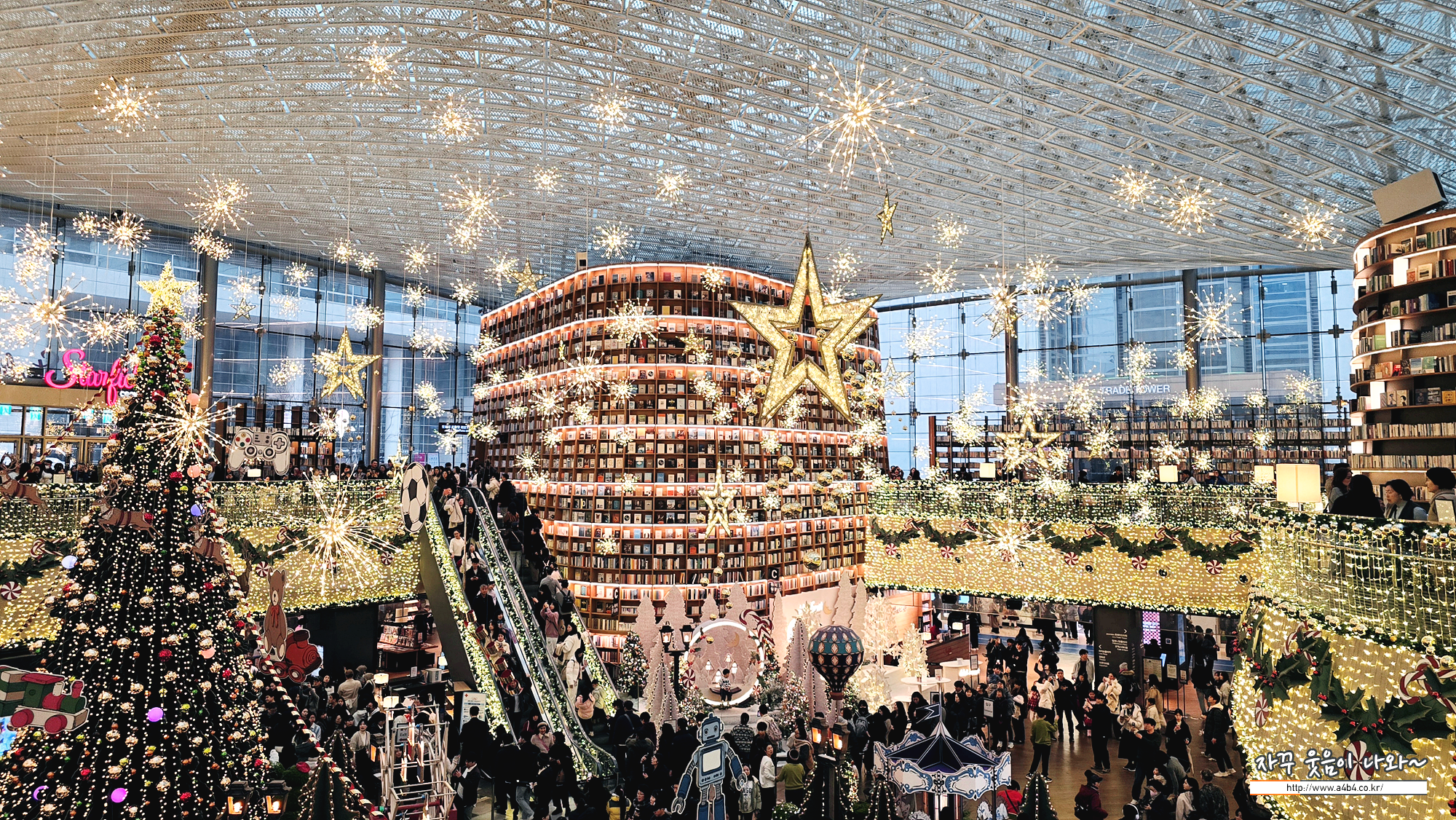 코엑스 별마당도서관은 여러 방향에서 들어올 수 있고요. 도서관 중앙에 거대한 크리스마스 트리가 설치되어 있습니다. K컬쳐 영향인이 올해 별마당도서관 크리스마스축제에는 외국인 관광객이 더 많은 것 같네요. 특히 히잡을 두른 동남아로 추청되는 관광객들이 엄청나게 많네요.